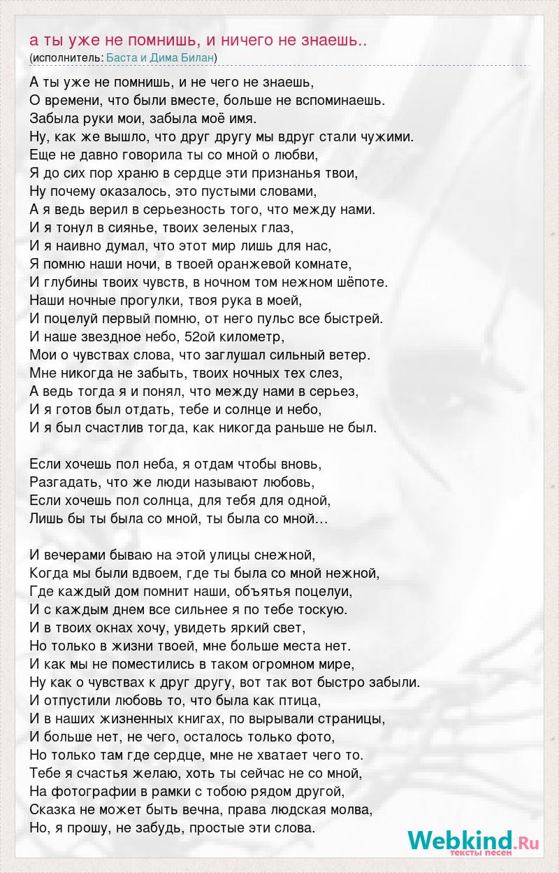 А ты уже не помнишь, и не чего не знаешь, О времени, что были вместе, больше не вспоминаешь. Забыла руки мои, забыла моё имя. Ну, как же вышло, что друг другу мы вдруг стали чужими. Еще не давно говорила ты со мной о любви, Я до сих пор храню в сердце эти признанья твои, Ну почему оказалось, это пустыми словами, А я ведь верил в серьезность того, что между нами. И я тонул в сиянье, твоих зеленых глаз, И я наивно думал, что этот мир лишь для нас, Я помню наши ночи, в твоей оранжевой комнате, И глубины твоих чувств, в ночном том нежном шёпоте. Наши ночные прогулки, твоя рука в моей, И поцелуй первый помню, от него пульс все быстрей. И наше звездное небо, 52ой километр, Мои о чувствах слова, что заглушал сильный ветер. Мне никогда не забыть, твоих ночных тех слез, А ведь тогда я и понял, что между нами в серьез, И я готов был отдать, тебе и солнце и небо, И я был счастлив тогда, как никогда раньше не был. Если хочешь пол неба, я отдам чтобы вновь, Разгадать, что же люди называют любовь, Если хочешь пол солнца, для тебя для одной, Лишь бы ты была со мной, ты была со мной… И вечерами бываю на этой улицы снежной, Когда мы были вдвоем, где ты была со мной нежной, Где каждый дом помнит наши, объятья поцелуи, И с каждым днем все сильнее я по тебе тоскую. И в твоих окнах хочу, увидеть яркий свет, Но только в жизни твоей, мне больше места нет. И как мы не поместились в таком огромном мире, Ну как о чувствах к друг другу, вот так вот быстро забыли. И отпустили любовь то, что была как птица, И в наших жизненных книгах, по вырывали страницы, И больше нет, не чего, осталось только фото, Но только там где сердце, мне не хватает чего то. Тебе я счастья желаю, хоть ты сейчас не со мной, На фотографии в рамки с тобою рядом другой, Сказка не может быть вечна, права людская молва, Но, я прошу, не забудь, простые эти слова.