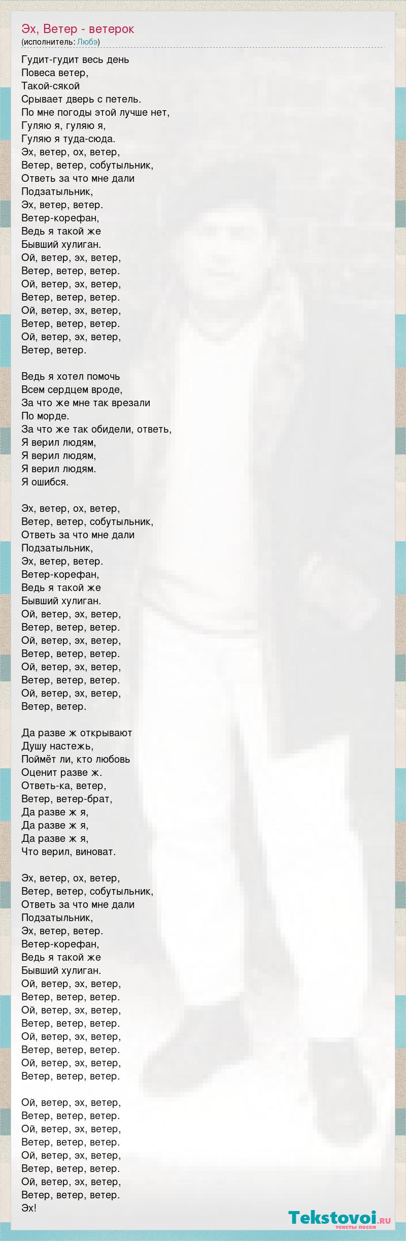 Гудит-гудит весь день Повеса ветер, Такой-сякой Срывает дверь с петель. По мне погоды этой лучше нет, Гуляю я, гуляю я, Гуляю я туда-сюда. Эх, ветер, ох, ветер, Ветер, ветер, собутыльник, Ответь за что мне дали Подзатыльник, Эх, ветер, ветер. Ветер-корефан, Ведь я такой же Бывший хулиган. Ой, ветер, эх, ветер, Ветер, ветер, ветер. Ой, ветер, эх, ветер, Ветер, ветер, ветер. Ой, ветер, эх, ветер, Ветер, ветер, ветер. Ой, ветер, эх, ветер, Ветер, ветер. Ведь я хотел помочь Всем сердцем вроде, За что же мне так врезали По морде. За что же так обидели, ответь, Я верил людям, Я верил людям, Я верил людям. Я ошибся. Эх, ветер, ох, ветер, Ветер, ветер, собутыльник, Ответь за что мне дали Подзатыльник, Эх, ветер, ветер. Ветер-корефан, Ведь я такой же Бывший хулиган. Ой, ветер, эх, ветер, Ветер, ветер, ветер. Ой, ветер, эх, ветер, Ветер, ветер, ветер. Ой, ветер, эх, ветер, Ветер, ветер, ветер. Ой, ветер, эх, ветер, Ветер, ветер. Да разве ж открывают Душу настежь, Поймёт ли, кто любовь Оценит разве ж. Ответь-ка, ветер, Ветер, ветер-брат, Да разве ж я, Да разве ж я, Да разве ж я, Что верил, виноват. Эх, ветер, ох, ветер, Ветер, ветер, собутыльник, Ответь за что мне дали Подзатыльник, Эх, ветер, ветер. Ветер-корефан, Ведь я такой же Бывший хулиган. Ой, ветер, эх, ветер, Ветер, ветер, ветер. Ой, ветер, эх, ветер, Ветер, ветер, ветер. Ой, ветер, эх, ветер, Ветер, ветер, ветер. Ой, ветер, эх, ветер, Ветер, ветер, ветер. Ой, ветер, эх, ветер, Ветер, ветер, ветер. Ой, ветер, эх, ветер, Ветер, ветер, ветер. Ой, ветер, эх, ветер, Ветер, ветер, ветер. Ой, ветер, эх, ветер, Ветер, ветер, ветер. Эх!