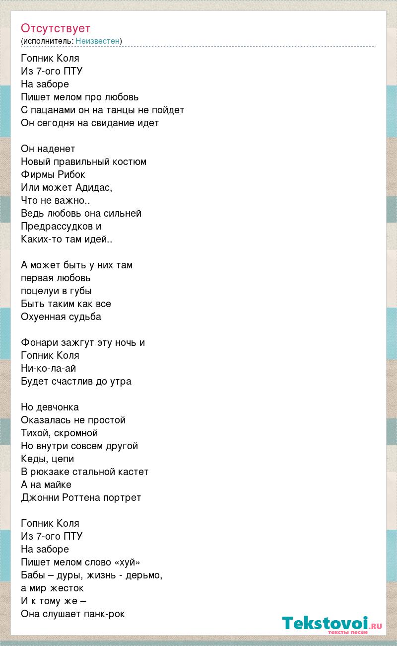 Гопник Коля Из 7-ого ПТУ На заборе Пишет мелом про любовь С пацанами он на танцы не пойдет Он сегодня на свидание идет Он наденет Новый правильный костюм Фирмы Рибок Или может Адидас, Что не важно.. Ведь любовь она сильней Предрассудков и Каких-то там идей.. А может быть у них там первая любовь поцелуи в губы Быть таким как все Охуенная судьба Фонари зажгут эту ночь и Гопник Коля Ни-ко-ла-ай Будет счастлив до утра Но девчонка Оказалась не простой Тихой, скромной Но внутри совсем другой Кеды, цепи В рюкзаке стальной кастет А на майке Джонни Роттена портрет Гопник Коля Из 7-ого ПТУ На заборе Пишет мелом слово «хуй» Бабы – дуры, жизнь - дерьмо, а мир жесток И к тому же – Она слушает панк-рок