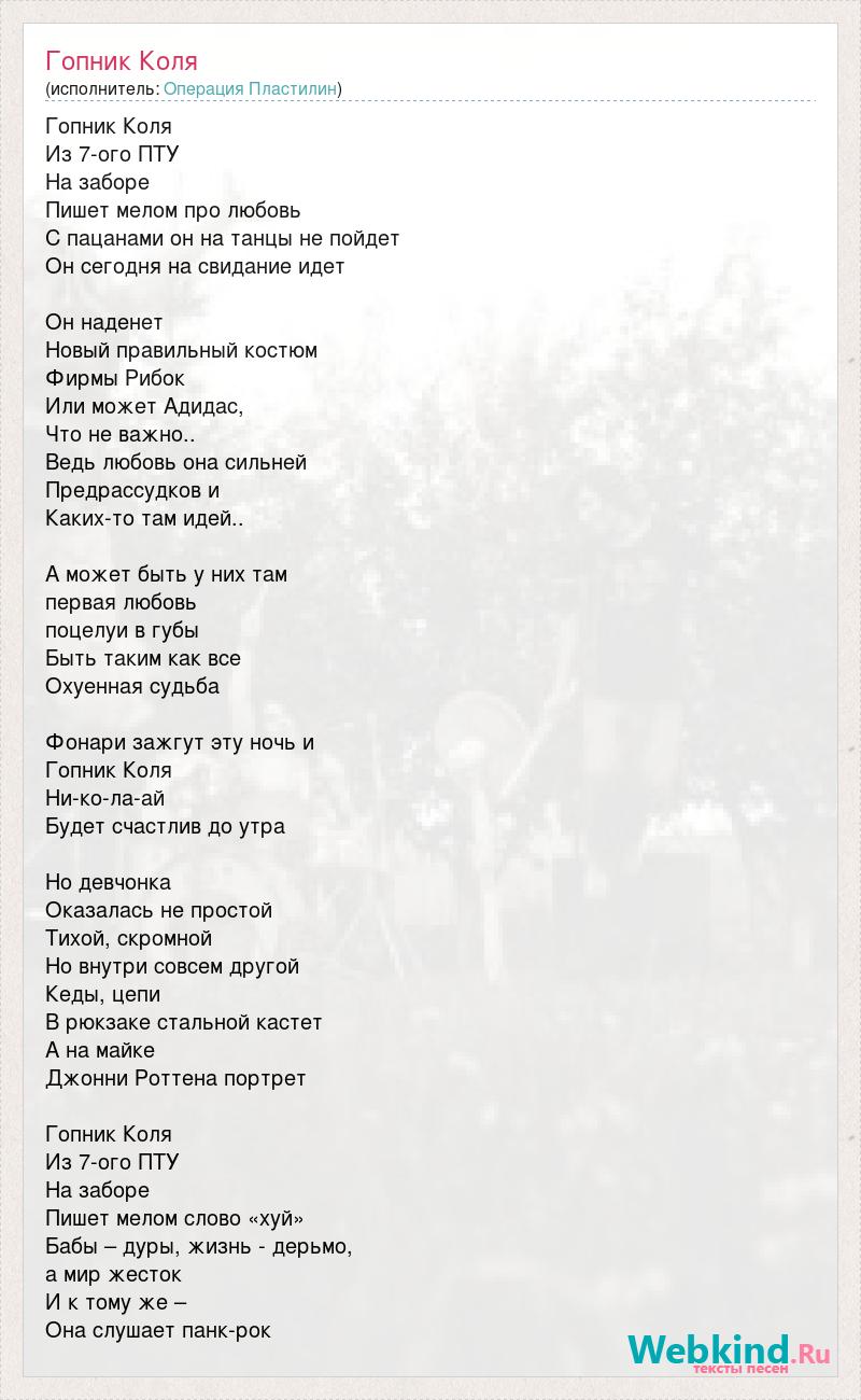 Гопник Коля Из 7-ого ПТУ На заборе Пишет мелом про любовь С пацанами он на танцы не пойдет Он сегодня на свидание идет Он наденет Новый правильный костюм Фирмы Рибок Или может Адидас, Что не важно.. Ведь любовь она сильней Предрассудков и Каких-то там идей.. А может быть у них там первая любовь поцелуи в губы Быть таким как все Охуенная судьба Фонари зажгут эту ночь и Гопник Коля Ни-ко-ла-ай Будет счастлив до утра Но девчонка Оказалась не простой Тихой, скромной Но внутри совсем другой Кеды, цепи В рюкзаке стальной кастет А на майке Джонни Роттена портрет Гопник Коля Из 7-ого ПТУ На заборе Пишет мелом слово «хуй» Бабы – дуры, жизнь - дерьмо, а мир жесток И к тому же – Она слушает панк-рок