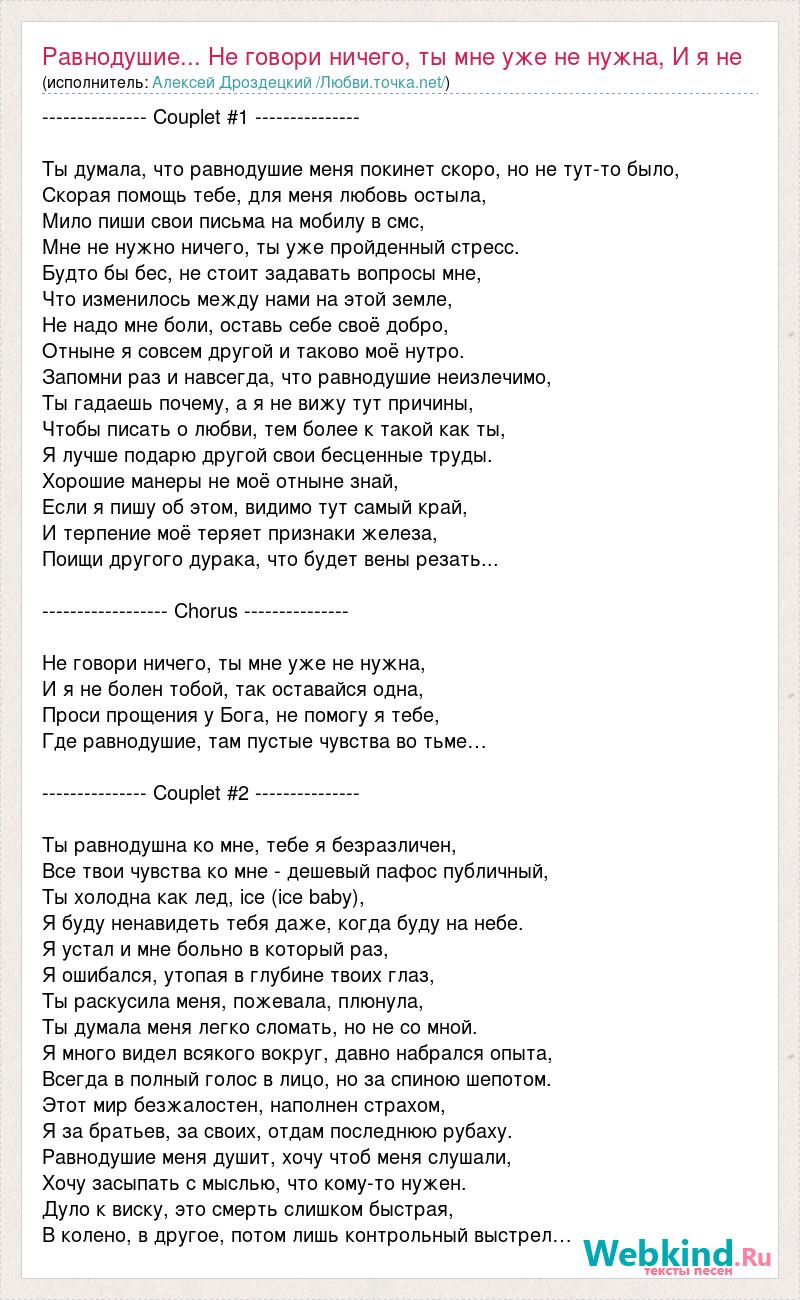Главная→Исполнители→Алексей Дроздецкий /Любви.точка.net/→Равнодушие... Не говори ничего, ты мне уже не нужна, И я не болен тобой, т