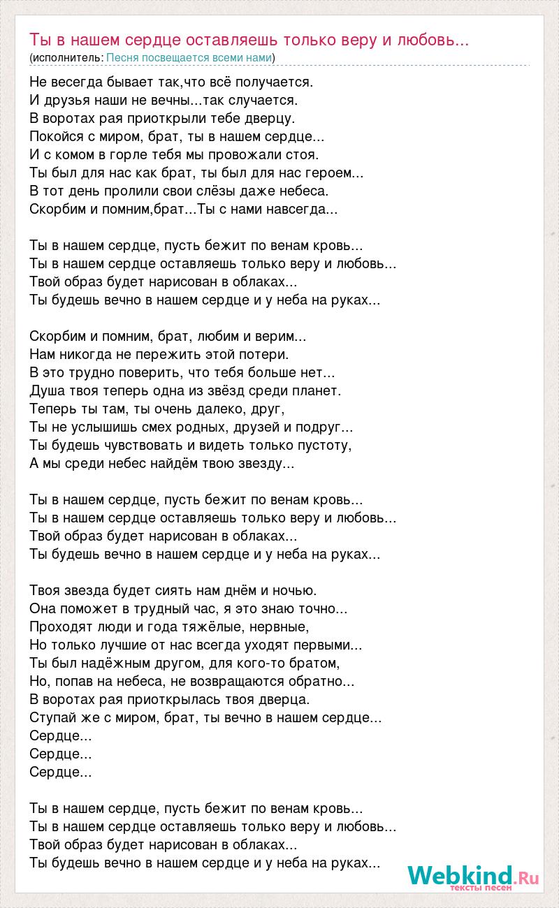 Не весегда бывает так,что всё получается. И друзья наши не вечны...так случается. В воротах рая приоткрыли тебе дверцу. Покойся с миром, брат, ты в нашем сердце... И с комом в горле тебя мы провожали стоя. Ты был для нас как брат, ты был для нас героем... В тот день пролили свои слёзы даже небеса. Скорбим и помним,брат...Ты с нами навсегда... Ты в нашем сердце, пусть бежит по венам кровь... Ты в нашем сердце оставляешь только веру и любовь... Твой образ будет нарисован в облаках... Ты будешь вечно в нашем сердце и у неба на руках... Скорбим и помним, брат, любим и верим... Нам никогда не пережить этой потери. В это трудно поверить, что тебя больше нет... Душа твоя теперь одна из звёзд среди планет. Теперь ты там, ты очень далеко, друг, Ты не услышишь смех родных, друзей и подруг... Ты будешь чувствовать и видеть только пустоту, А мы среди небес найдём твою звезду... Ты в нашем сердце, пусть бежит по венам кровь... Ты в нашем сердце оставляешь только веру и любовь... Твой образ будет нарисован в облаках... Ты будешь вечно в нашем сердце и у неба на руках... Твоя звезда будет сиять нам днём и ночью. Она поможет в трудный час, я это знаю точно... Проходят люди и года тяжёлые, нервные, Но только лучшие от нас всегда уходят первыми... Ты был надёжным другом, для кого-то братом, Но, попав на небеса, не возвращаются обратно... В воротах рая приоткрылась твоя дверца. Ступай же с миром, брат, ты вечно в нашем сердце... Сердце... Сердце... Сердце... Ты в нашем сердце, пусть бежит по венам кровь... Ты в нашем сердце оставляешь только веру и любовь... Твой образ будет нарисован в облаках... Ты будешь вечно в нашем сердце и у неба на руках...