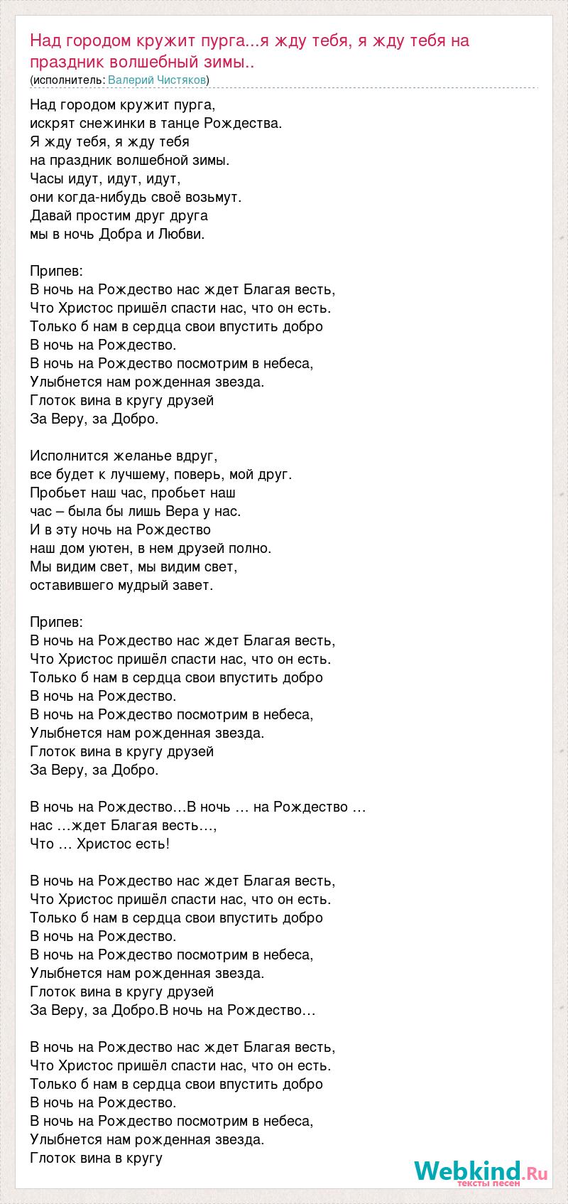 Над городом кружит пурга, искрят снежинки в танце Рождества. Я жду тебя, я жду тебя на праздник волшебной зимы. Часы идут, идут, идут, они когда-нибудь своё возьмут. Давай простим друг друга мы в ночь Добра и Любви. Припев: В ночь на Рождество нас ждет Благая весть, Что Христос пришёл спасти нас, что он есть. Только б нам в сердца свои впустить добро В ночь на Рождество. В ночь на Рождество посмотрим в небеса, Улыбнется нам рожденная звезда. Глоток вина в кругу друзей За Веру, за Добро. Исполнится желанье вдруг, все будет к лучшему, поверь, мой друг. Пробьет наш час, пробьет наш час – была бы лишь Вера у нас. И в эту ночь на Рождество наш дом уютен, в нем друзей полно. Мы видим свет, мы видим свет, оставившего мудрый завет. Припев: В ночь на Рождество нас ждет Благая весть, Что Христос пришёл спасти нас, что он есть. Только б нам в сердца свои впустить добро В ночь на Рождество. В ночь на Рождество посмотрим в небеса, Улыбнется нам рожденная звезда. Глоток вина в кругу друзей За Веру, за Добро. В ночь на Рождество…В ночь … на Рождество … нас …ждет Благая весть…, Что … Христос есть! В ночь на Рождество нас ждет Благая весть, Что Христос пришёл спасти нас, что он есть. Только б нам в сердца свои впустить добро В ночь на Рождество. В ночь на Рождество посмотрим в небеса, Улыбнется нам рожденная звезда. Глоток вина в кругу друзей За Веру, за Добро.В ночь на Рождество… В ночь на Рождество нас ждет Благая весть, Что Христос пришёл спасти нас, что он есть. Только б нам в сердца свои впустить добро В ночь на Рождество. В ночь на Рождество посмотрим в небеса, Улыбнется нам рожденная звезда. Глоток вина в кругу