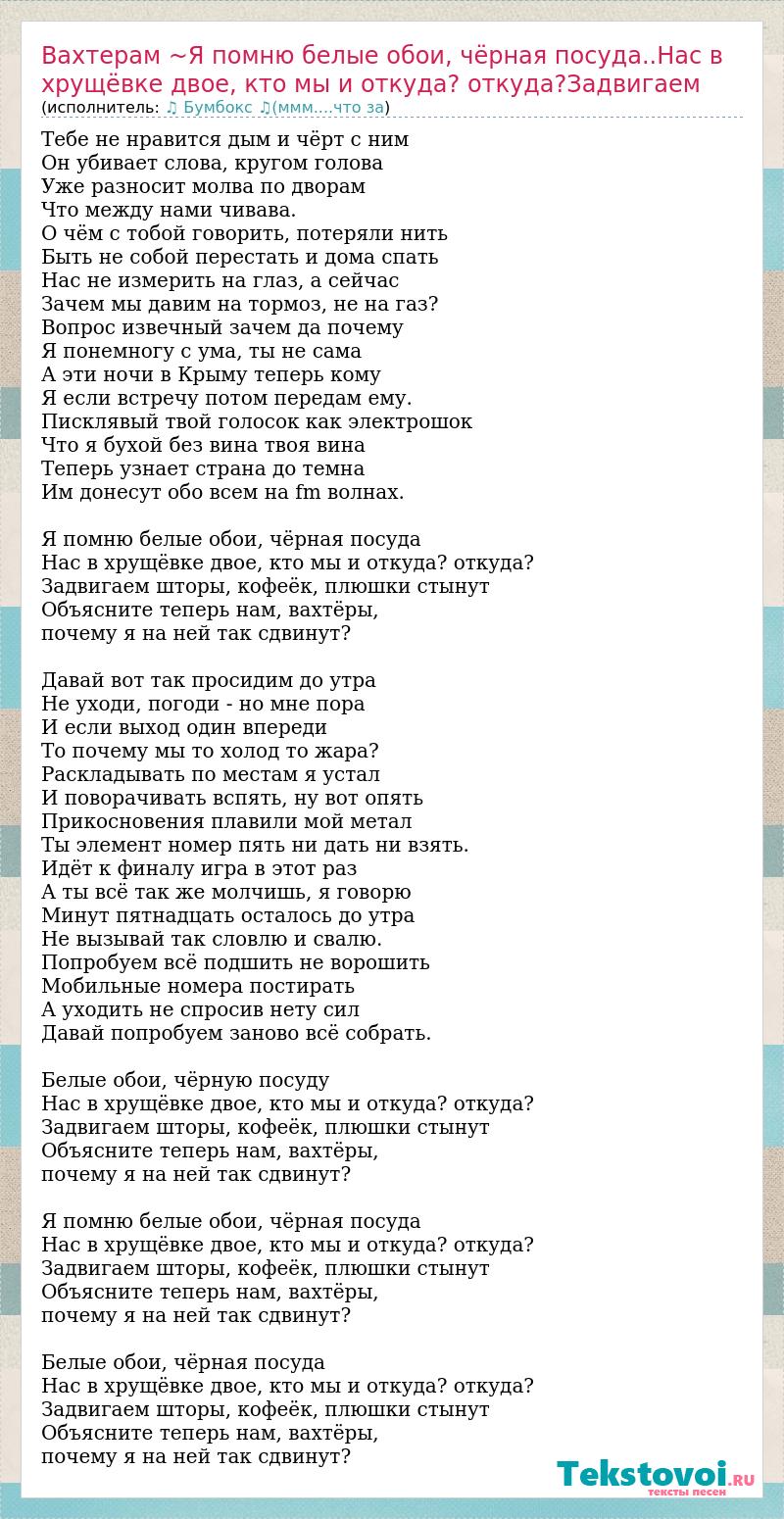 Тебе не нравится дым и чёрт с ним Он убивает слова, кругом голова Уже разносит молва по дворам Что между нами чивава. О чём с тобой говорить, потеряли нить Быть не собой перестать и дома спать Нас не измерить на глаз, а сейчас Зачем мы давим на тормоз, не на газ? Вопрос извечный зачем да почему Я понемногу с ума, ты не сама А эти ночи в Крыму теперь кому Я если встречу потом передам ему. Писклявый твой голосок как электрошок Что я бухой без вина твоя вина Теперь узнает страна до темна Им донесут обо всем на fm волнах. Я помню белые обои, чёрная посуда Нас в хрущёвке двое, кто мы и откуда? откуда? Задвигаем шторы, кофеёк, плюшки стынут Объясните теперь нам, вахтёры, почему я на ней так сдвинут? Давай вот так просидим до утра Не уходи, погоди - но мне пора И если выход один впереди То почему мы то холод то жара? Раскладывать по местам я устал И поворачивать вспять, ну вот опять Прикосновения плавили мой метал Ты элемент номер пять ни дать ни взять. Идёт к финалу игра в этот раз А ты всё так же молчишь, я говорю Минут пятнадцать осталось до утра Не вызывай так словлю и свалю. Попробуем всё подшить не ворошить Мобильные номера постирать А уходить не спросив нету сил Давай попробуем заново всё собрать. Белые обои, чёрную посуду Нас в хрущёвке двое, кто мы и откуда? откуда? Задвигаем шторы, кофеёк, плюшки стынут Объясните теперь нам, вахтёры, почему я на ней так сдвинут? Я помню белые обои, чёрная посуда Нас в хрущёвке двое, кто мы и откуда? откуда? Задвигаем шторы, кофеёк, плюшки стынут Объясните теперь нам, вахтёры, почему я на ней так сдвинут? Белые обои, чёрная посуда Нас в хрущёвке двое, кто мы и откуда? откуда? Задвигаем шторы, кофеёк, плюшки стынут Объясните теперь нам, вахтёры, почему я на ней так сдвинут?