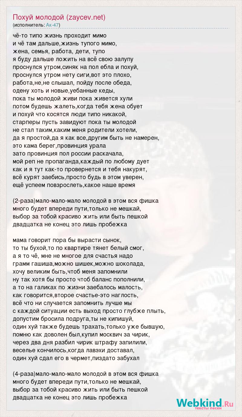чё-то типо жизнь проходит мимо и чё там дальше,жизнь тупого мимо, жена, семья, работа, дети, тупо я буду дальше ложить на всё свою залупу проснулся утром,синяк на пол ебла и похуй, проснулся утром нету сиги,вот это плохо, работа,не,не слышал, пойду после обеда, одену хоть и новые,уебанные кеды, пока ты молодой живи пока живется хули потом будешь жалеть,когда тебя жена обует и похуй что косятся люди типо никакой, старперы пусть завидуют пока ты молодой не стал таким,каким меня родители хотели, да я простой,да я как все,другим быть не намерен, это кама берег,провинция урала зато провинция пол россии раскачала, мой реп не пропаганда,каждый по любому дует как и я тут как-то провернется и тебя накурят, всё курят заебись,просто будь в этом уверен, ещё успеем повзрослеть,какое наше время (2-раза)мало-мало-мало молодой в этом вся фишка много будет впереди пути,только не мешкай, выбор за тобой красиво жить или быть пешкой двадцатка не конец это лишь пробежка мама говорит пора бы вырасти сынок, то ты бухой,то по квартире тянет белый смог, а я то чё, мне не многое для счастья надо грамм гашиша,можно шишек,можно шоколада, хочу великим быть,чтоб меня запомнили ну так хотя бы просто чтоб баланс пополнили, а то на галиках по жизни заебалось малость, как говорится,второе счастье-это наглость, всё что ни случается запомнить лучше мы с каждой ситуации есть выход просто глубже плыть, допустим бросила подруга,ты не кипишуй, один хуй также будешь трахать,только уже бывшую, помню как доволен был,купил москвич за чирик, через два дня разбил чирик штрафу запилили, веселье кончилось,когда лавэхи доставал, один хуй сдал его в чермет,пиздато забухал (4-раза)мало-мало-мало молодой в этом вся фишка много будет впереди пути,только не мешкай, выбор за тобой красиво жить или быть пешкой двадцатка не конец это лишь пробежка