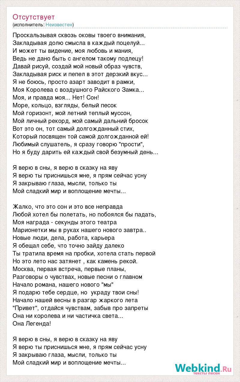 Проскальзывая сквозь оковы твоего внимания, Закладывая долю смысла в каждый поцелуй... И может ты видение, моя любовь и мания, Ведь не дано быть с ангелом такому подлецу! Давай рисуй, создай мой новый образ чувств, Закладывая риск и пепел в этот дерзкий вкус... Я не боюсь, просто азарт заводит в рамки, Моя Королева с воздушного Райского Замка... Моя, и правда моя... Нет! Сон! Море, кольцо, взгляды, белый песок Мой горизонт, мой летний теплый муссон, Мой личный рекорд, мой самый дальний бросок Вот это он, тот самый долгожданный стих, Который посвящен той самой долгожданной ей! Любимый слушатель, я сразу говорю "прости", Но я буду дарить ей каждый свой безумный день... Я верю в сны, я верю в сказку на яву Я верю ты приснишься мне, я прям сейчас усну Я закрываю глаза, мысли, только ты Мой сладкий мир и воплощение мечты... Жалко, что это сон и это все неправда Любой хотел бы полетать, но побоялся бы падать, Моя награда - секунды этого театра Марионетки мы в руках нашего нового завтра.. Новые люди, дела, работа, карьера Я обещал себе, что точно зайду далеко Ты тратила время на пробки, хотела стать первой Но это лето нас затянет , как камень рекой. Москва, первая встреча, первые планы, Разговоры о чувствах, новые песни о главном Начало романа, нашего нового "мы" Я подарю тебе сердце, но украду твои сны! Начало нашей весны в разгар жаркого лета "Привет", отдайся чувствам, забыв про запреты Она ни королева и ни частичка света... Она Легенда! Я верю в сны, я верю в сказку на яву Я верю ты приснишься мне, я прям сейчас усну Я закрываю глаза, мысли, только ты Мой сладкий мир и воплощение мечты...
