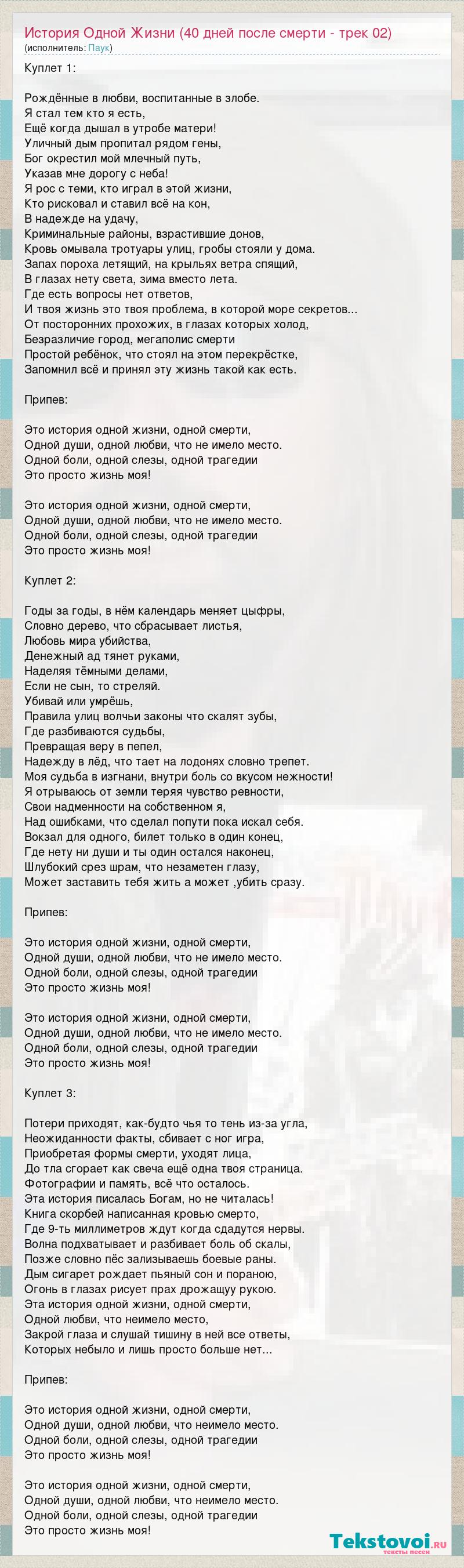 Куплет 1: Рождённые в любви, воспитанные в злобе. Я стал тем кто я есть, Ещё когда дышал в утробе матери! Уличный дым пропитал рядом гены, Бог окрестил мой млечный путь, Указав мне дорогу с неба! Я рос с теми, кто играл в этой жизни, Кто рисковал и ставил всё на кон, В надежде на удачу, Криминальные районы, взрастившие донов, Кровь омывала тротуары улиц, гробы стояли у дома. Запах пороха летящий, на крыльях ветра спящий, В глазах нету света, зима вместо лета. Где есть вопросы нет ответов, И твоя жизнь это твоя проблема, в которой море секретов... От посторонних прохожих, в глазах которых холод, Безразличие город, мегаполис смерти Простой ребёнок, что стоял на этом перекрёстке, Запомнил всё и принял эту жизнь такой как есть. Припев: Это история одной жизни, одной смерти, Одной души, одной любви, что не имело место. Одной боли, одной слезы, одной трагедии Это просто жизнь моя! Это история одной жизни, одной смерти, Одной души, одной любви, что не имело место. Одной боли, одной слезы, одной трагедии Это просто жизнь моя! Куплет 2: Годы за годы, в нём календарь меняет цыфры, Словно дерево, что сбрасывает листья, Любовь мира убийства, Денежный ад тянет руками, Наделяя тёмными делами, Если не сын, то стреляй. Убивай или умрёшь, Правила улиц волчьи законы что скалят зубы, Где разбиваются судьбы, Превращая веру в пепел, Надежду в лёд, что тает на лодонях словно трепет. Моя судьба в изгнани, внутри боль со вкусом нежности! Я отрываюсь от земли теряя чувство ревности, Свои надменности на собственном я, Над ошибками, что сделал попути пока искал себя. Вокзал для одного, билет только в один конец, Где нету ни души и ты один остался наконец, Шлубокий срез шрам, что незаметен глазу, Может заставить тебя жить а может ,убить сразу. Припев: Это история одной жизни, одной смерти, Одной души, одной любви, что не имело место. Одной боли, одной слезы, одной трагедии Это просто жизнь моя! Это история одной жизни, одной смерти, Одной души, одной любви, что не имело место. Одной боли, одной слезы, одной трагедии Это просто жизнь моя! Куплет 3: Потери приходят, как-будто чья то тень из-за угла, Неожиданности факты, сбивает с ног игра, Приобретая формы смерти, уходят лица, До тла сгорает как свеча ещё одна твоя страница. Фотографии и память, всё что осталось. Эта история писалась Богам, но не читалась! Книга скорбей написанная кровью смерто, Где 9-ть миллиметров ждут когда сдадутся нервы. Волна подхватывает и разбивает боль об скалы, Позже словно пёс зализываешь боевые раны. Дым сигарет рождает пьяный сон и пораною, Огонь в глазах рисует прах дрожащуу рукою. Эта история одной жизни, одной смерти, Одной любви, что неимело место, Закрой глаза и слушай тишину в ней все ответы, Которых небыло и лишь просто больше нет... Припев: Это история одной жизни, одной смерти, Одной души, одной любви, что неимело место. Одной боли, одной слезы, одной трагедии Это просто жизнь моя! Это история одной жизни, одной смерти, Одной души, одной любви, что неимело место. Одной боли, одной слезы, одной трагедии Это просто жизнь моя!