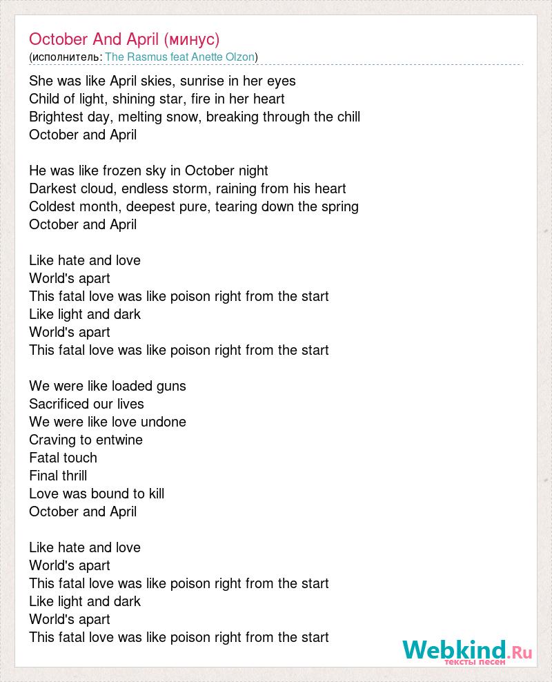 She was like April skies, sunrise in her eyes Child of light, shining star, fire in her heart Brightest day, melting snow, breaking through the chill October and April He was like frozen sky in October night Darkest cloud, endless storm, raining from his heart Coldest month, deepest pure, tearing down the spring October and April Like hate and love World's apart This fatal love was like poison right from the start Like light and dark World's apart This fatal love was like poison right from the start We were like loaded guns Sacrificed our lives We were like love undone Craving to entwine Fatal touch Final thrill Love was bound to kill October and April Like hate and love World's apart This fatal love was like poison right from the start Like light and dark World's apart This fatal love was like poison right from the start