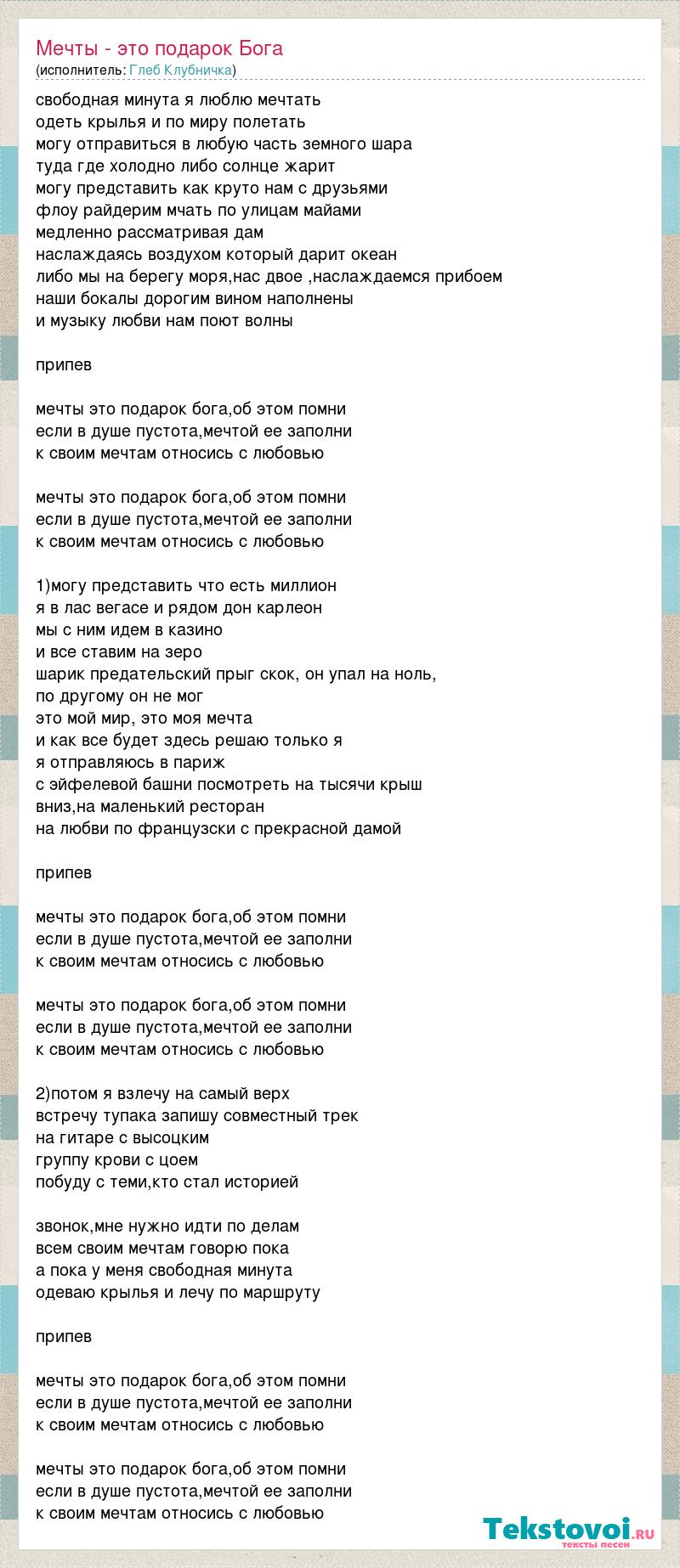 свободная минута я люблю мечтать одеть крылья и по миру полетать могу отправиться в любую часть земного шара туда где холодно либо солнце жарит могу представить как круто нам с друзьями флоу райдерим мчать по улицам майами медленно рассматривая дам наслаждаясь воздухом который дарит океан либо мы на берегу моря,нас двое ,наслаждаемся прибоем наши бокалы дорогим вином наполнены и музыку любви нам поют волны припев мечты это подарок бога,об этом помни если в душе пустота,мечтой ее заполни к своим мечтам относись с любовью мечты это подарок бога,об этом помни если в душе пустота,мечтой ее заполни к своим мечтам относись с любовью 1)могу представить что есть миллион я в лас вегасе и рядом дон карлеон мы с ним идем в казино и все ставим на зеро шарик предательский прыг скок, он упал на ноль, по другому он не мог это мой мир, это моя мечта и как все будет здесь решаю только я я отправляюсь в париж с эйфелевой башни посмотреть на тысячи крыш вниз,на маленький ресторан на любви по французски с прекрасной дамой припев мечты это подарок бога,об этом помни если в душе пустота,мечтой ее заполни к своим мечтам относись с любовью мечты это подарок бога,об этом помни если в душе пустота,мечтой ее заполни к своим мечтам относись с любовью 2)потом я взлечу на самый верх встречу тупака запишу совместный трек на гитаре с высоцким группу крови с цоем побуду с теми,кто стал историей звонок,мне нужно идти по делам всем своим мечтам говорю пока а пока у меня свободная минута одеваю крылья и лечу по маршруту припев мечты это подарок бога,об этом помни если в душе пустота,мечтой ее заполни к своим мечтам относись с любовью мечты это подарок бога,об этом помни если в душе пустота,мечтой ее заполни к своим мечтам относись с любовью