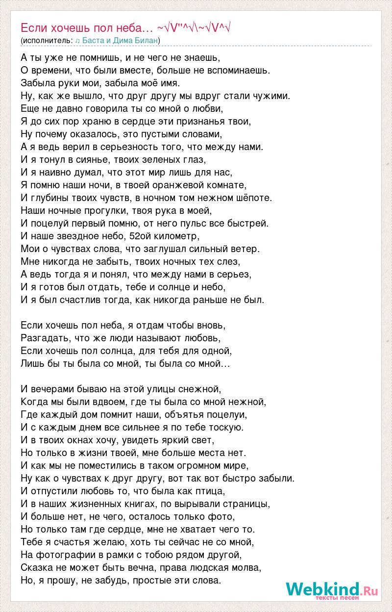 А ты уже не помнишь, и не чего не знаешь, О времени, что были вместе, больше не вспоминаешь. Забыла руки мои, забыла моё имя. Ну, как же вышло, что друг другу мы вдруг стали чужими. Еще не давно говорила ты со мной о любви, Я до сих пор храню в сердце эти признанья твои, Ну почему оказалось, это пустыми словами, А я ведь верил в серьезность того, что между нами. И я тонул в сиянье, твоих зеленых глаз, И я наивно думал, что этот мир лишь для нас, Я помню наши ночи, в твоей оранжевой комнате, И глубины твоих чувств, в ночном том нежном шёпоте. Наши ночные прогулки, твоя рука в моей, И поцелуй первый помню, от него пульс все быстрей. И наше звездное небо, 52ой километр, Мои о чувствах слова, что заглушал сильный ветер. Мне никогда не забыть, твоих ночных тех слез, А ведь тогда я и понял, что между нами в серьез, И я готов был отдать, тебе и солнце и небо, И я был счастлив тогда, как никогда раньше не был. Если хочешь пол неба, я отдам чтобы вновь, Разгадать, что же люди называют любовь, Если хочешь пол солнца, для тебя для одной, Лишь бы ты была со мной, ты была со мной… И вечерами бываю на этой улицы снежной, Когда мы были вдвоем, где ты была со мной нежной, Где каждый дом помнит наши, объятья поцелуи, И с каждым днем все сильнее я по тебе тоскую. И в твоих окнах хочу, увидеть яркий свет, Но только в жизни твоей, мне больше места нет. И как мы не поместились в таком огромном мире, Ну как о чувствах к друг другу, вот так вот быстро забыли. И отпустили любовь то, что была как птица, И в наших жизненных книгах, по вырывали страницы, И больше нет, не чего, осталось только фото, Но только там где сердце, мне не хватает чего то. Тебе я счастья желаю, хоть ты сейчас не со мной, На фотографии в рамки с тобою рядом другой, Сказка не может быть вечна, права людская молва, Но, я прошу, не забудь, простые эти слова.