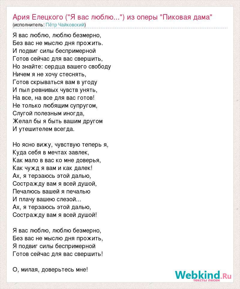 Я вас люблю, люблю безмерно, Без вас не мыслю дня прожить. И подвиг силы беспримерной Готов сейчас для вас свершить, Но знайте: сердца вашего свободу Ничем я не хочу стеснять, Готов скрываться вам в угоду И пыл ревнивых чувств унять, На все, на все для вас готов! Не только любящим супругом, Слугой полезным иногда, Желал бы я быть вашим другом И утешителем всегда. Но ясно вижу, чувствую теперь я, Куда себя в мечтах завлек, Как мало в вас ко мне доверья, Как чужд я вам и как далек! Ах, я терзаюсь этой далью, Состражду вам я всей душой, Печалюсь вашей я печалью И плачу вашею слезой... Ах, я терзаюсь этой далью, Состражду вам я всей душой! Я вас люблю, люблю безмерно, Без вас не мыслю дня прожить, Я подвиг силы беспримерной Готов сейчас для вас свершить! О, милая, доверьтесь мне!