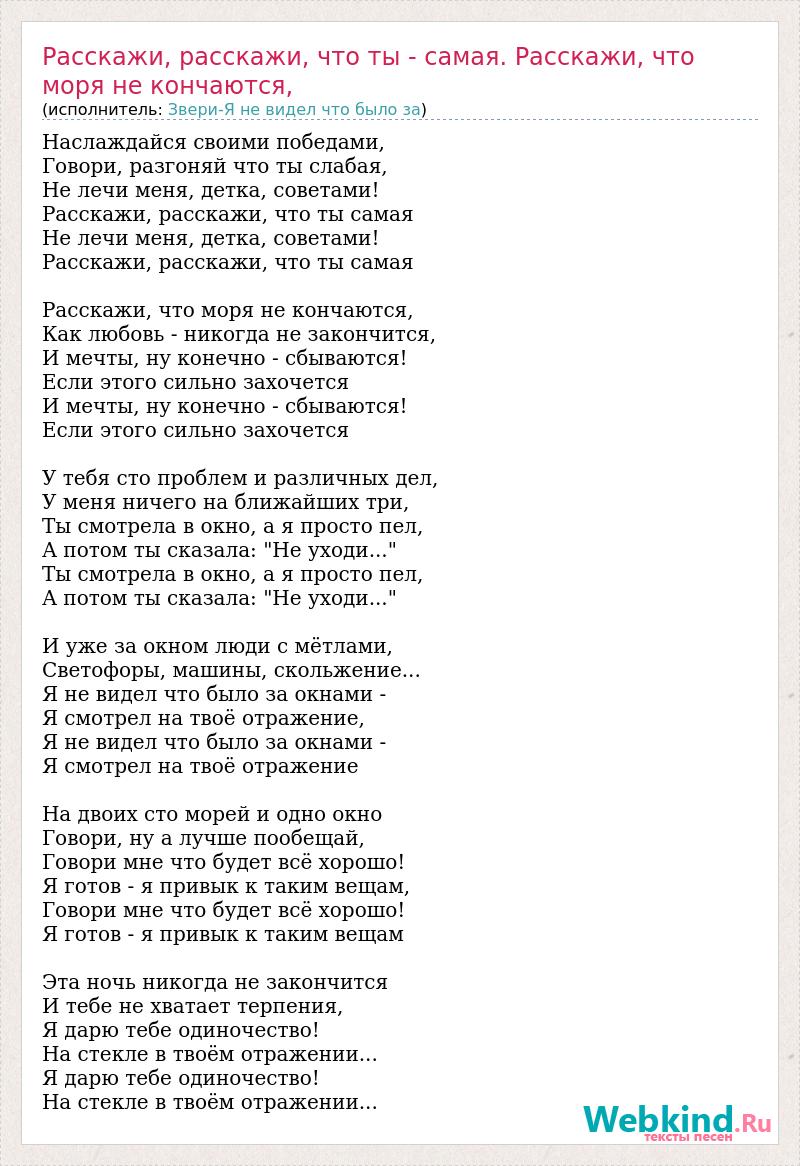 Главная→Исполнители→Звери-Я не видел что было за→Расскажи, расскажи, что ты - самая. Расскажи, что моря не кончаются,