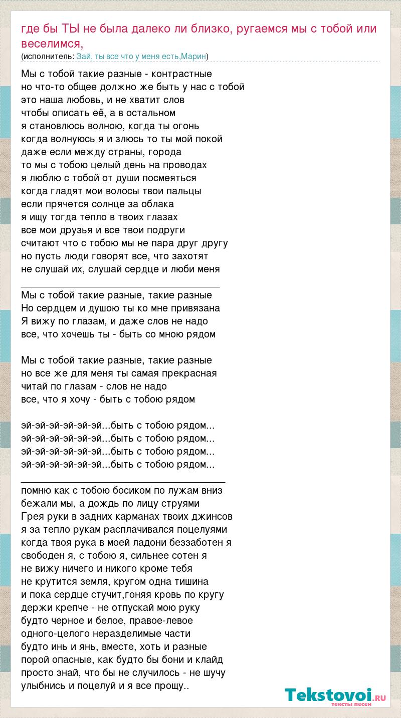 Мы с тобой такие разные - контрастные но что-то общее должно же быть у нас с тобой это наша любовь, и не хватит слов чтобы описать её, а в остальном я становлюсь волною, когда ты огонь когда волнуюсь я и злюсь то ты мой покой даже если между страны, города то мы с тобою целый день на проводах я люблю с тобой от души посмеяться когда гладят мои волосы твои пальцы если прячется солнце за облака я ищу тогда тепло в твоих глазах все мои друзья и все твои подруги считают что с тобою мы не пара друг другу но пусть люди говорят все, что захотят не слушай их, слушай сердце и люби меня ____________________________________ Мы с тобой такие разные, такие разные Но сердцем и душою ты ко мне привязана Я вижу по глазам, и даже слов не надо все, что хочешь ты - быть со мною рядом Мы с тобой такие разные, такие разные но все же для меня ты самая прекрасная читай по глазам - слов не надо все, что я хочу - быть с тобою рядом эй-эй-эй-эй-эй-эй...быть с тобою рядом... эй-эй-эй-эй-эй-эй...быть с тобою рядом... эй-эй-эй-эй-эй-эй...быть с тобою рядом... эй-эй-эй-эй-эй-эй...быть с тобою рядом... _____________________________________ помню как с тобою босиком по лужам вниз бежали мы, а дождь по лицу струями Грея руки в задних карманах твоих джинсов я за тепло рукам расплачивался поцелуями когда твоя рука в моей ладони беззаботен я свободен я, с тобою я, сильнее сотен я не вижу ничего и никого кроме тебя не крутится земля, кругом одна тишина и пока сердце стучит,гоняя кровь по кругу держи крепче - не отпускай мою руку будто черное и белое, правое-левое одного-целого неразделимые части будто инь и янь, вместе, хоть и разные порой опасные, как будто бы бони и клайд просто знай, что бы не случилось - не шучу улыбнись и поцелуй и я все прощу..