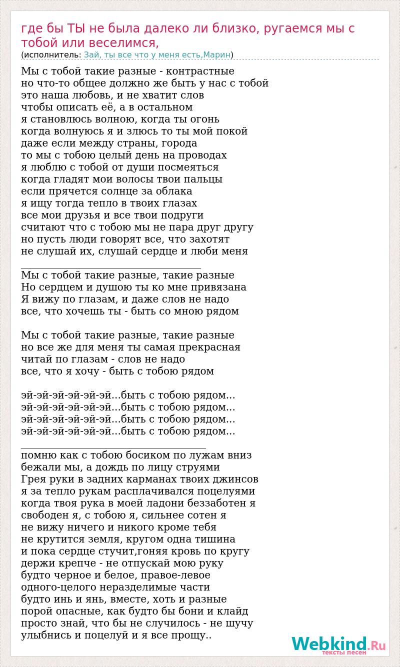 Мы с тобой такие разные - контрастные но что-то общее должно же быть у нас с тобой это наша любовь, и не хватит слов чтобы описать её, а в остальном я становлюсь волною, когда ты огонь когда волнуюсь я и злюсь то ты мой покой даже если между страны, города то мы с тобою целый день на проводах я люблю с тобой от души посмеяться когда гладят мои волосы твои пальцы если прячется солнце за облака я ищу тогда тепло в твоих глазах все мои друзья и все твои подруги считают что с тобою мы не пара друг другу но пусть люди говорят все, что захотят не слушай их, слушай сердце и люби меня ____________________________________ Мы с тобой такие разные, такие разные Но сердцем и душою ты ко мне привязана Я вижу по глазам, и даже слов не надо все, что хочешь ты - быть со мною рядом Мы с тобой такие разные, такие разные но все же для меня ты самая прекрасная читай по глазам - слов не надо все, что я хочу - быть с тобою рядом эй-эй-эй-эй-эй-эй...быть с тобою рядом... эй-эй-эй-эй-эй-эй...быть с тобою рядом... эй-эй-эй-эй-эй-эй...быть с тобою рядом... эй-эй-эй-эй-эй-эй...быть с тобою рядом... _____________________________________ помню как с тобою босиком по лужам вниз бежали мы, а дождь по лицу струями Грея руки в задних карманах твоих джинсов я за тепло рукам расплачивался поцелуями когда твоя рука в моей ладони беззаботен я свободен я, с тобою я, сильнее сотен я не вижу ничего и никого кроме тебя не крутится земля, кругом одна тишина и пока сердце стучит,гоняя кровь по кругу держи крепче - не отпускай мою руку будто черное и белое, правое-левое одного-целого неразделимые части будто инь и янь, вместе, хоть и разные порой опасные, как будто бы бони и клайд просто знай, что бы не случилось - не шучу улыбнись и поцелуй и я все прощу..
