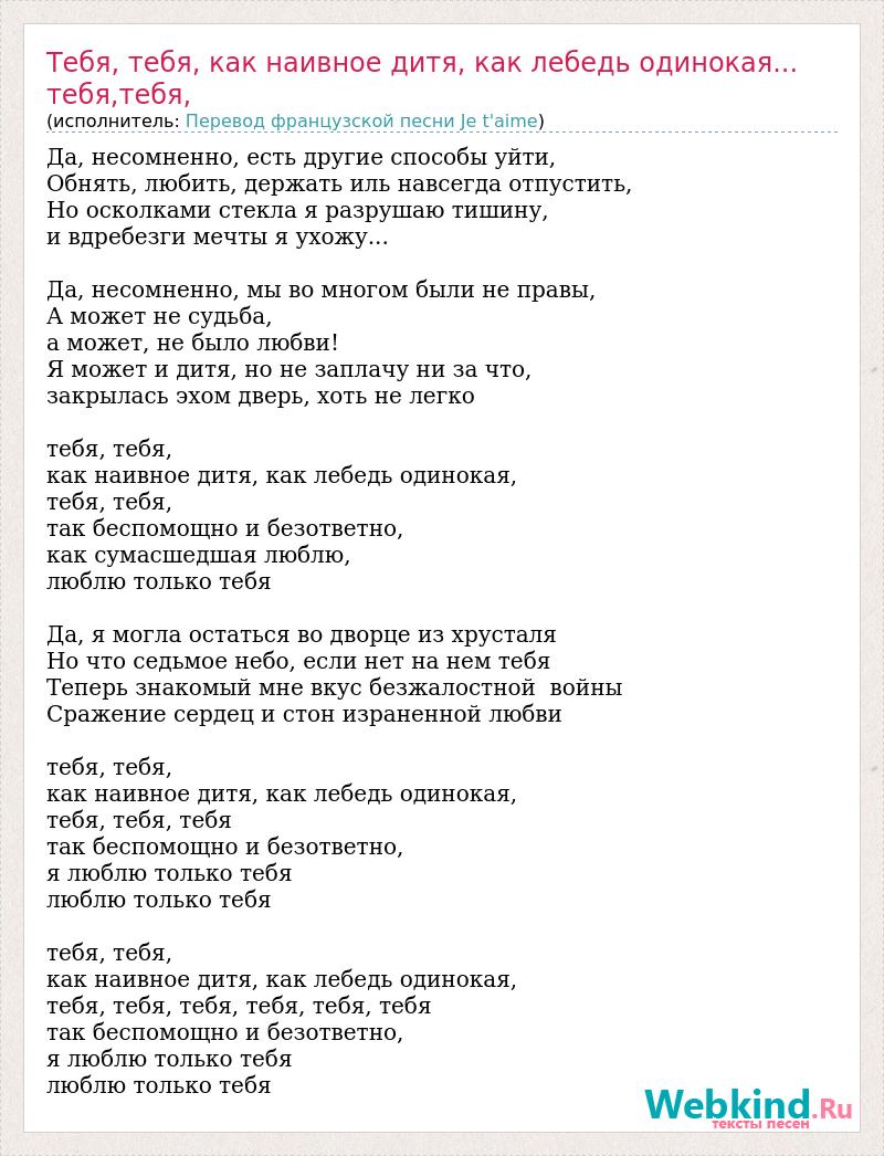 Да, несомненно, есть другие способы уйти, Обнять, любить, держать иль навсегда отпустить, Но осколками стекла я разрушаю тишину, и вдребезги мечты я ухожу... Да, несомненно, мы во многом были не правы, А может не судьба, а может, не было любви! Я может и дитя, но не заплачу ни за что, закрылась эхом дверь, хоть не легко тебя, тебя, как наивное дитя, как лебедь одинокая, тебя, тебя, так беспомощно и безответно, как сумасшедшая люблю, люблю только тебя Да, я могла остаться во дворце из хрусталя Но что седьмое небо, если нет на нем тебя Теперь знакомый мне вкус безжалостной войны Сражение сердец и стон израненной любви тебя, тебя, как наивное дитя, как лебедь одинокая, тебя, тебя, тебя так беспомощно и безответно, я люблю только тебя люблю только тебя тебя, тебя, как наивное дитя, как лебедь одинокая, тебя, тебя, тебя, тебя, тебя, тебя так беспомощно и безответно, я люблю только тебя люблю только тебя