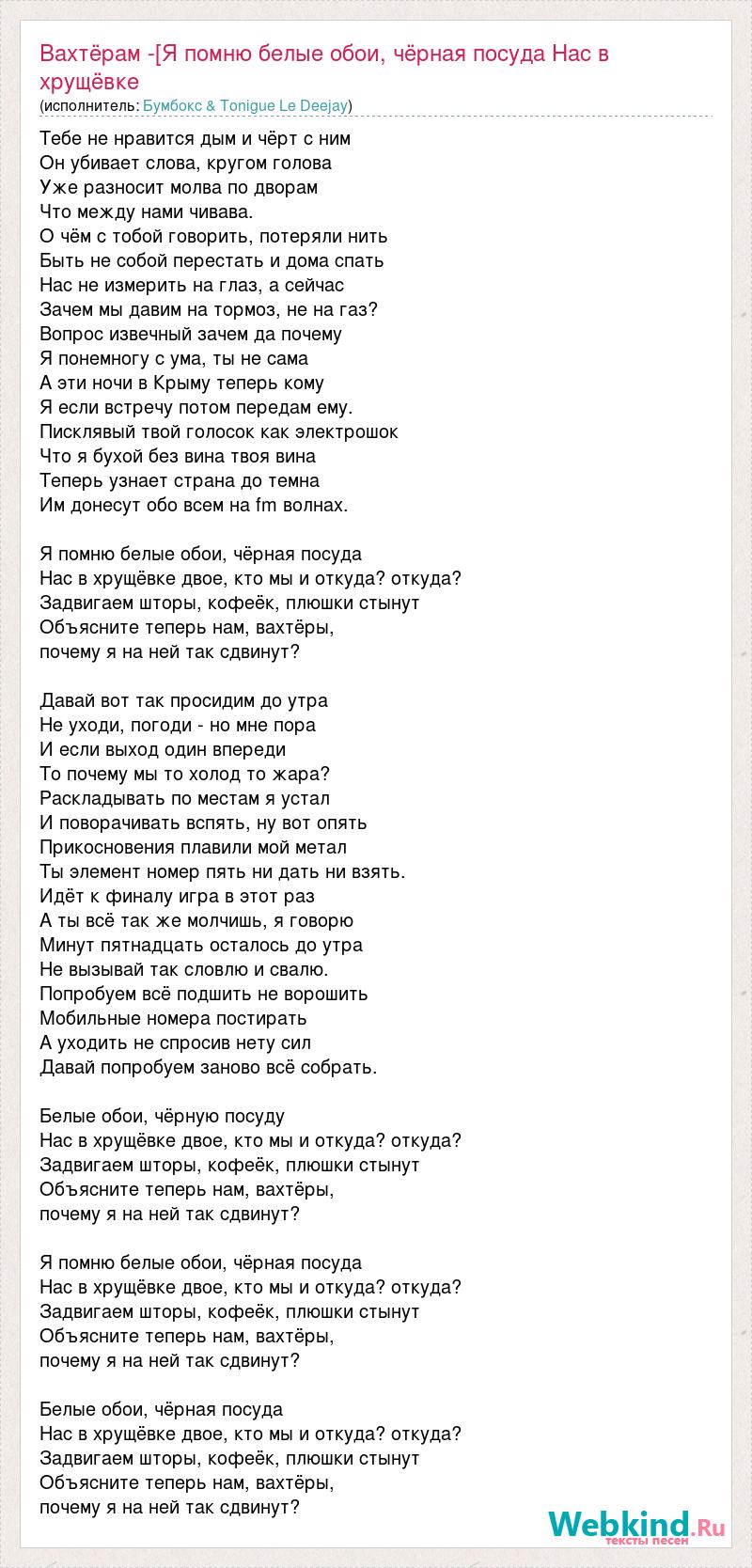 Тебе не нравится дым и чёрт с ним Он убивает слова, кругом голова Уже разносит молва по дворам Что между нами чивава. О чём с тобой говорить, потеряли нить Быть не собой перестать и дома спать Нас не измерить на глаз, а сейчас Зачем мы давим на тормоз, не на газ? Вопрос извечный зачем да почему Я понемногу с ума, ты не сама А эти ночи в Крыму теперь кому Я если встречу потом передам ему. Писклявый твой голосок как электрошок Что я бухой без вина твоя вина Теперь узнает страна до темна Им донесут обо всем на fm волнах. Я помню белые обои, чёрная посуда Нас в хрущёвке двое, кто мы и откуда? откуда? Задвигаем шторы, кофеёк, плюшки стынут Объясните теперь нам, вахтёры, почему я на ней так сдвинут? Давай вот так просидим до утра Не уходи, погоди - но мне пора И если выход один впереди То почему мы то холод то жара? Раскладывать по местам я устал И поворачивать вспять, ну вот опять Прикосновения плавили мой метал Ты элемент номер пять ни дать ни взять. Идёт к финалу игра в этот раз А ты всё так же молчишь, я говорю Минут пятнадцать осталось до утра Не вызывай так словлю и свалю. Попробуем всё подшить не ворошить Мобильные номера постирать А уходить не спросив нету сил Давай попробуем заново всё собрать. Белые обои, чёрную посуду Нас в хрущёвке двое, кто мы и откуда? откуда? Задвигаем шторы, кофеёк, плюшки стынут Объясните теперь нам, вахтёры, почему я на ней так сдвинут? Я помню белые обои, чёрная посуда Нас в хрущёвке двое, кто мы и откуда? откуда? Задвигаем шторы, кофеёк, плюшки стынут Объясните теперь нам, вахтёры, почему я на ней так сдвинут? Белые обои, чёрная посуда Нас в хрущёвке двое, кто мы и откуда? откуда? Задвигаем шторы, кофеёк, плюшки стынут Объясните теперь нам, вахтёры, почему я на ней так сдвинут?