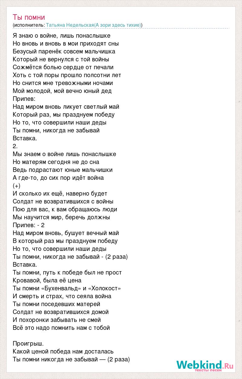 Я знаю о войне, лишь понаслышке Но вновь и вновь в мои приходят сны Безусый паренёк совсем мальчишка Который не вернулся с той войны Сожмётся болью сердце от печали Хоть с той поры прошло полсотни лет Но снится мне тревожными ночами Мой молодой, мой вечно юный дед Припев: Над миром вновь ликует светлый май Который раз, мы празднуем победу Но то, что совершили наши деды Ты помни, никогда не забывай Вставка. 2. Мы знаем о войне лишь понаслышке Но матерям сегодня не до сна Ведь подрастают юные мальчишки А где-то, до сих пор идёт война (+) И сколько их ещё, наверно будет Солдат не возвратившихся с войны Пою для вас, к вам обращаюсь люди Мы научится мир, беречь должны Припев: - 2 Над миром вновь, бушует вечный май В который раз мы празднуем победу Но то, что совершили наши деды Ты помни, никогда не забывай - (2 раза) Вставка. Ты помни, путь к победе был не прост Кровавой, была её цена Ты помни «Бухенвальд» и «Холокост» И смерть и страх, что сеяла война Ты помни поседевших матерей Солдат не возвратившихся домой И похоронки забывать не смей Всё это надо помнить нам с тобой Проигрыш. Какой ценой победа нам досталась Ты помни никогда не забывай — (2 раза)