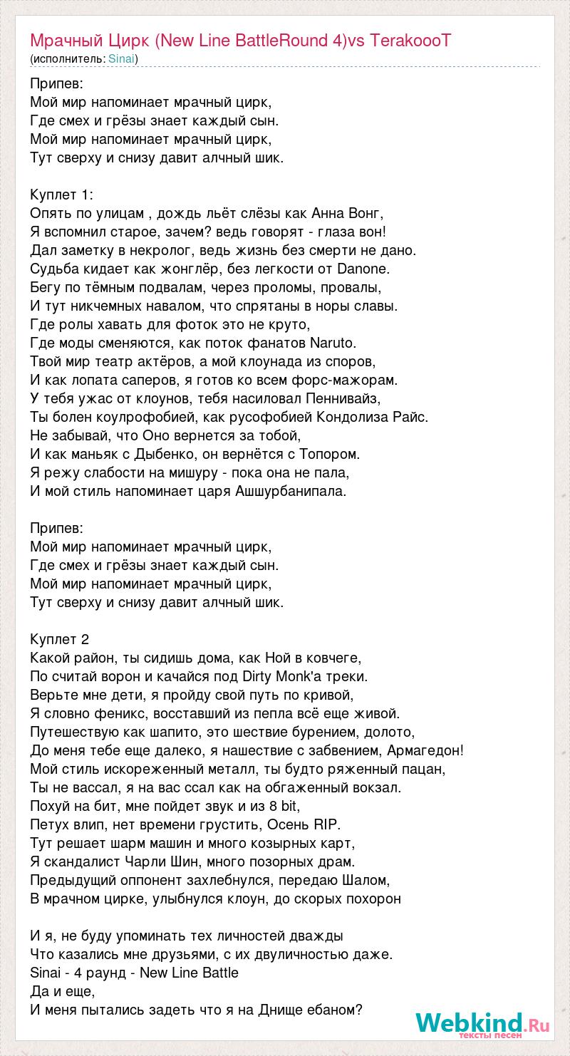 Припев: Мой мир напоминает мрачный цирк, Где смех и грёзы знает каждый сын. Мой мир напоминает мрачный цирк, Тут сверху и снизу давит алчный шик. Куплет 1: Опять по улицам , дождь льёт слёзы как Анна Вонг, Я вспомнил старое, зачем? ведь говорят - глаза вон! Дал заметку в некролог, ведь жизнь без смерти не дано. Судьба кидает как жонглёр, без легкости от Danone. Бегу по тёмным подвалам, через проломы, провалы, И тут никчемных навалом, что спрятаны в норы славы. Где ролы хавать для фоток это не круто, Где моды сменяются, как поток фанатов Naruto. Твой мир театр актёров, а мой клоунада из споров, И как лопата саперов, я готов ко всем форс-мажорам. У тебя ужас от клоунов, тебя насиловал Пеннивайз, Ты болен коулрофобией, как русофобией Кондолиза Райс. Не забывай, что Оно вернется за тобой, И как маньяк с Дыбенко, он вернётся с Топором. Я режу слабости на мишуру - пока она не пала, И мой стиль напоминает царя Ашшурбанипала. Припев: Мой мир напоминает мрачный цирк, Где смех и грёзы знает каждый сын. Мой мир напоминает мрачный цирк, Тут сверху и снизу давит алчный шик. Куплет 2 Какой район, ты сидишь дома, как Ной в ковчеге, По считай ворон и качайся под Dirty Monk'а треки. Верьте мне дети, я пройду свой путь по кривой, Я словно феникс, восставший из пепла всё еще живой. Путешествую как шапито, это шествие бурением, долото, До меня тебе еще далеко, я нашествие с забвением, Армагедон! Мой стиль искореженный металл, ты будто ряженный пацан, Ты не вассал, я на вас ссал как на обгаженный вокзал. Похуй на бит, мне пойдет звук и из 8 bit, Петух влип, нет времени грустить, Осень RIP. Тут решает шарм машин и много козырных карт, Я скандалист Чарли Шин, много позорных драм. Предыдущий оппонент захлебнулся, передаю Шалом, В мрачном цирке, улыбнулся клоун, до скорых похорон И я, не буду упоминать тех личностей дважды Что казались мне друзьями, с их двуличностью даже. Sinai - 4 раунд - New Line Battle Да и еще, И меня пытались задеть что я на Днище ебаном?