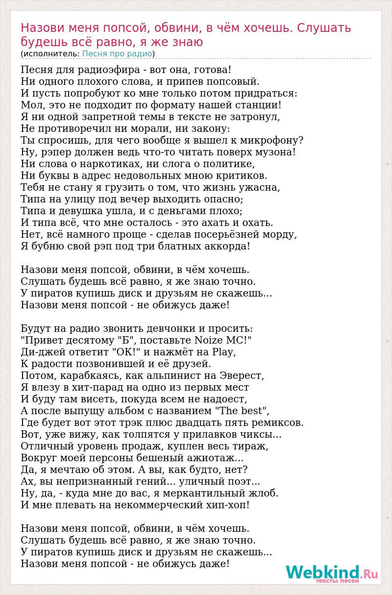 Главная→Исполнители→Песня про радио→Назови меня попсой, обвини, в чём хочешь. Слушать будешь всё равно, я же