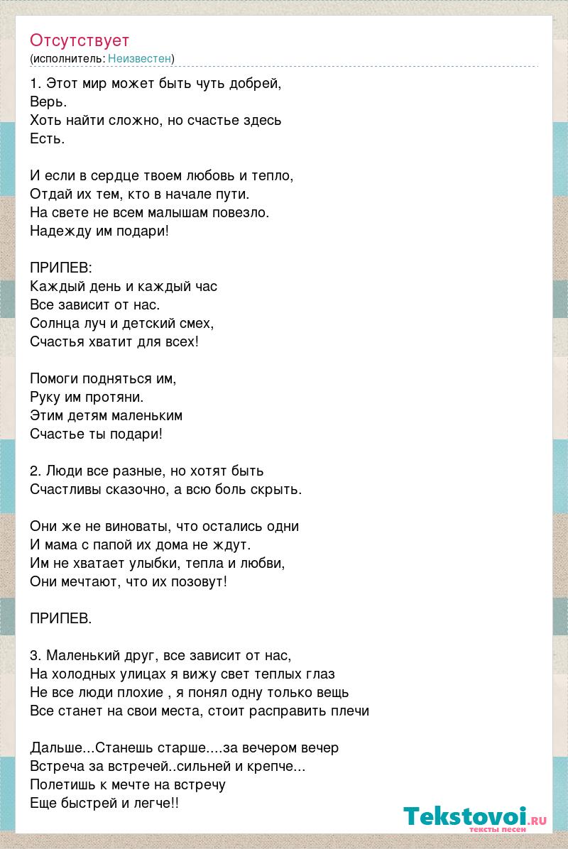 1. Этот мир может быть чуть добрей, Верь. Хоть найти сложно, но счастье здесь Есть. И если в сердце твоем любовь и тепло, Отдай их тем, кто в начале пути. На свете не всем малышам повезло. Надежду им подари! ПРИПЕВ: Каждый день и каждый час Все зависит от нас. Солнца луч и детский смех, Счастья хватит для всех! Помоги подняться им, Руку им протяни. Этим детям маленьким Счастье ты подари! 2. Люди все разные, но хотят быть Счастливы сказочно, а всю боль скрыть. Они же не виноваты, что остались одни И мама с папой их дома не ждут. Им не хватает улыбки, тепла и любви, Они мечтают, что их позовут! ПРИПЕВ. 3. Маленький друг, все зависит от нас, На холодных улицах я вижу свет теплых глаз Не все люди плохие , я понял одну только вещь Все станет на свои места, стоит расправить плечи Дальше...Станешь старше....за вечером вечер Встреча за встречей..сильней и крепче... Полетишь к мечте на встречу Еще быстрей и легче!!