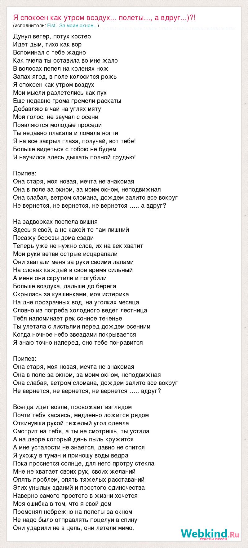 Дунул ветер, потух костер Идет дым, тихо как вор Вспоминал о тебе жадно Как пчела ты оставила во мне жало В волосах пепел на коленях нож Запах ягод, в поле колосится рожь Я спокоен как утром воздух Мои мысли разлетелись как пух Еще недавно грома гремели раскаты Добавляю в чай на углях мяту Мой голос, не звучал с осени Появляются молодые проседи Ты недавно плакала и ломала ногти Я на все закрыл глаза, получай, вот тебе! Больше видеться с тобою не будем Я научился здесь дышать полной грудью! Припев: Она старя, моя новая, мечта не знакомая Она в поле за окном, за моим окном, неподвижная Она слабая, ветром сломана, дождем залито все вокруг Не вернется, не вернется, не вернется ….. а вдруг? На задворках поспела вишня Здесь я свой, а не какой-то там лишний Посажу березы дома сзади Теперь уже не нужно слов, их на век хватит Мои руки ветви острые исцарапали Они хватали меня за руки своими лапами На словах каждый в свое время сильный А меня они скрутили и погубили Больше воздуха, дальше до берега Скрылась за кувшинками, моя истерика На дне прозрачных вод, на уголках месяца Словно из погреба холодного ведет лестница Тебя напоминает рек сонное теченье Ты улетала с листьями перед дождем осенним Когда ночное небо звездами покрывается Я знаю точно наперед, оно тебе понравится Припев: Она старя, моя новая, мечта не знакомая Она в поле за окном, за моим окном, неподвижная Она слабая, ветром сломана, дождем залито все вокруг Не вернется, не вернется, не вернется ….. вдруг? Всегда идет возле, провожает взглядом Почти тебя касаясь, медленно ложится рядом Откинувши рукой тяжелый угол одеяла Смотрит на тебя, а ты не смотришь, ты устала А на дворе который день пыль кружится А мне усталости не знается, давно не спится Я ухожу в туман и приношу воды ведра Пока проснется солнце, для него протру стекла Мне не хватает своих рук, своих желаний Опять проблем, опять тяжелых расставаний Этих унылых зданий и простого одиночества Наверно самого простого в жизни хочется Моя ошибка в том, что я свой дом Променял небрежно на полеты за окном Не надо было отправлять поцелуи в спину Они ударили не в цель, они летели мимо.