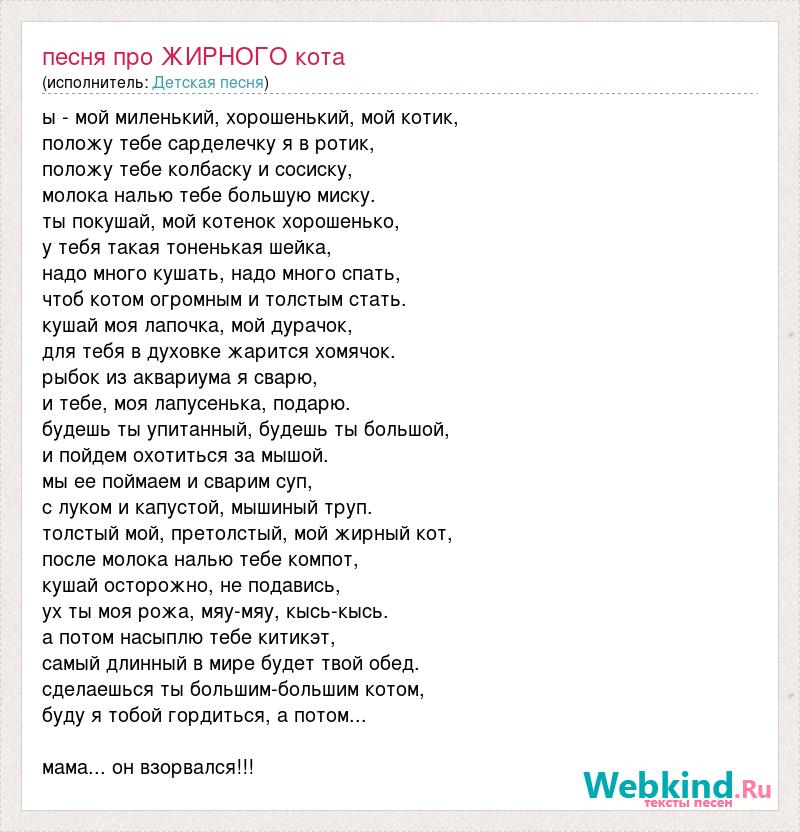 ы - мой миленький, хорошенький, мой котик, положу тебе сарделечку я в ротик, положу тебе колбаску и сосиску, молока налью тебе большую миску. ты покушай, мой котенок хорошенько, у тебя такая тоненькая шейка, надо много кушать, надо много спать, чтоб котом огромным и толстым стать. кушай моя лапочка, мой дурачок, для тебя в духовке жарится хомячок. рыбок из аквариума я сварю, и тебе, моя лапусенька, подарю. будешь ты упитанный, будешь ты большой, и пойдем охотиться за мышой. мы ее поймаем и сварим суп, с луком и капустой, мышиный труп. толстый мой, претолстый, мой жирный кот, после молока налью тебе компот, кушай осторожно, не подавись, ух ты моя рожа, мяу-мяу, кысь-кысь. а потом насыплю тебе китикэт, самый длинный в мире будет твой обед. сделаешься ты большим-большим котом, буду я тобой гордиться, а потом... мама... он взорвался!!!