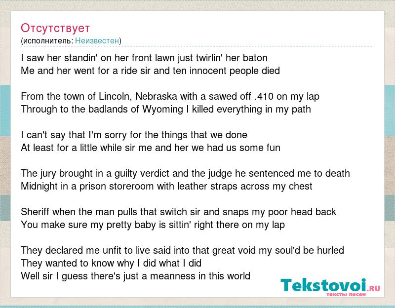 I saw her standin' on her front lawn just twirlin' her baton Me and her went for a ride sir and ten innocent people died From the town of Lincoln, Nebraska with a sawed off .410 on my lap Through to the badlands of Wyoming I killed everything in my path I can't say that I'm sorry for the things that we done At least for a little while sir me and her we had us some fun The jury brought in a guilty verdict and the judge he sentenced me to death Midnight in a prison storeroom with leather straps across my chest Sheriff when the man pulls that switch sir and snaps my poor head back You make sure my pretty baby is sittin' right there on my lap They declared me unfit to live said into that great void my soul'd be hurled They wanted to know why I did what I did Well sir I guess there's just a meanness in this world