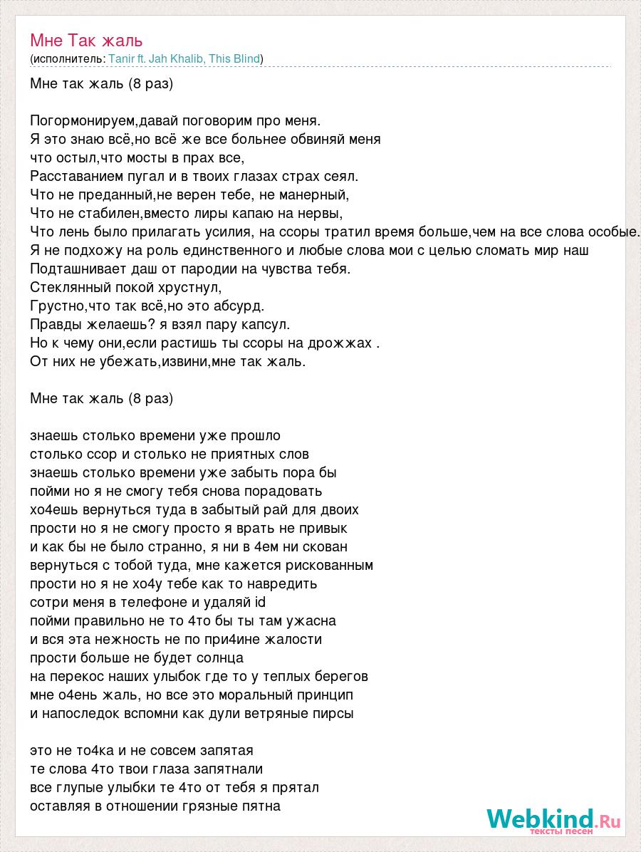Мне так жаль (8 раз) Погормонируем,давай поговорим про меня. Я это знаю всё,но всё же все больнее обвиняй меня что остыл,что мосты в прах все, Расставанием пугал и в твоих глазах страх сеял. Что не преданный,не верен тебе, не манерный, Что не стабилен,вместо лиры капаю на нервы, Что лень было прилагать усилия, на ссоры тратил время больше,чем на все слова особые. Я не подхожу на роль единственного и любые слова мои с целью сломать мир наш Подташнивает даш от пародии на чувства тебя. Стеклянный покой хрустнул, Грустно,что так всё,но это абсурд. Правды желаешь? я взял пару капсул. Но к чему они,если растишь ты ссоры на дрожжах . От них не убежать,извини,мне так жаль. Мне так жаль (8 раз) знаешь столько времени уже прошло столько ссор и столько не приятных слов знаешь столько времени уже забыть пора бы пойми но я не смогу тебя снова порадовать хо4ешь вернуться туда в забытый рай для двоих прости но я не смогу просто я врать не привык и как бы не было странно, я ни в 4ем ни скован вернуться с тобой туда, мне кажется рискованным прости но я не хо4у тебе как то навредить сотри меня в телефоне и удаляй id пойми правильно не то 4то бы ты там ужасна и вся эта нежность не по при4ине жалости прости больше не будет солнца на перекос наших улыбок где то у теплых берегов мне о4ень жаль, но все это моральный принцип и напоследок вспомни как дули ветряные пирсы это не то4ка и не совсем запятая те слова 4то твои глаза запятнали все глупые улыбки те 4то от тебя я прятал оставляя в отношении грязные пятна
