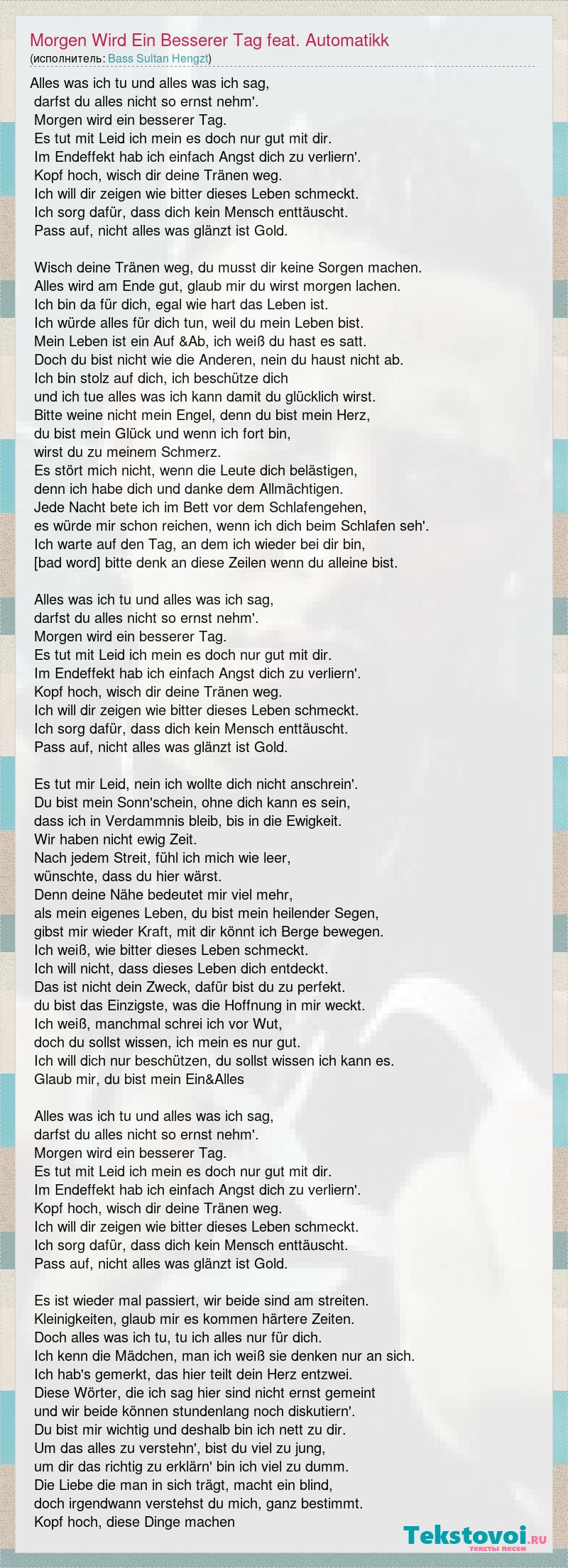 Alles was ich tu und alles was ich sag, darfst du alles nicht so ernst nehm'. Morgen wird ein besserer Tag. Es tut mit Leid ich mein es doch nur gut mit dir. Im Endeffekt hab ich einfach Angst dich zu verliern'. Kopf hoch, wisch dir deine Tränen weg. Ich will dir zeigen wie bitter dieses Leben schmeckt. Ich sorg dafür, dass dich kein Mensch enttäuscht. Pass auf, nicht alles was glänzt ist Gold. Wisch deine Tränen weg, du musst dir keine Sorgen machen. Alles wird am Ende gut, glaub mir du wirst morgen lachen. Ich bin da für dich, egal wie hart das Leben ist. Ich würde alles für dich tun, weil du mein Leben bist. Mein Leben ist ein Auf &Ab, ich weiß du hast es satt. Doch du bist nicht wie die Anderen, nein du haust nicht ab. Ich bin stolz auf dich, ich beschütze dich und ich tue alles was ich kann damit du glücklich wirst. Bitte weine nicht mein Engel, denn du bist mein Herz, du bist mein Glück und wenn ich fort bin, wirst du zu meinem Schmerz. Es stört mich nicht, wenn die Leute dich belästigen, denn ich habe dich und danke dem Allmächtigen. Jede Nacht bete ich im Bett vor dem Schlafengehen, es würde mir schon reichen, wenn ich dich beim Schlafen seh'. Ich warte auf den Tag, an dem ich wieder bei dir bin, darum bitte denk an diese Zeilen wenn du alleine bist. Alles was ich tu und alles was ich sag, darfst du alles nicht so ernst nehm'. Morgen wird ein besserer Tag. Es tut mit Leid ich mein es doch nur gut mit dir. Im Endeffekt hab ich einfach Angst dich zu verliern'. Kopf hoch, wisch dir deine Tränen weg. Ich will dir zeigen wie bitter dieses Leben schmeckt. Ich sorg dafür, dass dich kein Mensch enttäuscht. Pass auf, nicht alles was glänzt ist Gold. Es tut mir Leid, nein ich wollte dich nicht anschrein'. Du bist mein Sonn'schein, ohne dich kann es sein, dass ich in Verdammnis bleib, bis in die Ewigkeit. Wir haben nicht ewig Zeit. Nach jedem Streit, fühl ich mich wie leer, wünschte, dass du hier wärst. Denn deine Nähe bedeutet mir viel mehr, als mein eigenes Leben, du bist mein heilender Segen, gibst mir wieder Kraft, mit dir könnt ich Berge bewegen. Ich weiß, wie bitter dieses Leben schmeckt. Ich will nicht, dass dieses Leben dich entdeckt. Das ist nicht dein Zweck, dafür bist du zu perfekt. du bist das Einzigste, was die Hoffnung in mir weckt. Ich weiß, manchmal schrei ich vor Wut, doch du sollst wissen, ich mein es nur gut. Ich will dich nur beschützen, du sollst wissen ich kann es. Glaub mir, du bist mein Ein&Alles Alles was ich tu und alles was ich sag, darfst du alles nicht so ernst nehm'. Morgen wird ein besserer Tag. Es tut mit Leid ich mein es doch nur gut mit dir. Im Endeffekt hab ich einfach Angst dich zu verliern'. Kopf hoch, wisch dir deine Tränen weg. Ich will dir zeigen wie bitter dieses Leben schmeckt. Ich sorg dafür, dass dich kein Mensch enttäuscht. Pass auf, nicht alles was glänzt ist Gold. Es ist wieder mal passiert, wir beide sind am streiten. Kleinigkeiten, glaub mir es kommen härtere Zeiten. Doch alles was ich tu, tu ich alles nur für dich. Ich kenn die Mädchen, man ich weiß sie denken nur an sich. Ich hab's gemerkt, das hier teilt dein Herz entzwei. Diese Wörter, die ich sag hier sind nicht ernst gemeint und wir beide können stundenlang noch diskutiern'. Du bist mir wichtig und deshalb bin ich nett zu dir. Um das alles zu verstehn', bist du viel zu jung, um dir das richtig zu erklärn' bin ich viel zu dumm. Die Liebe die man in sich trägt, macht ein blind, doch irgendwann verstehst du mich, ganz bestimmt. Kopf hoch, diese Dinge machen