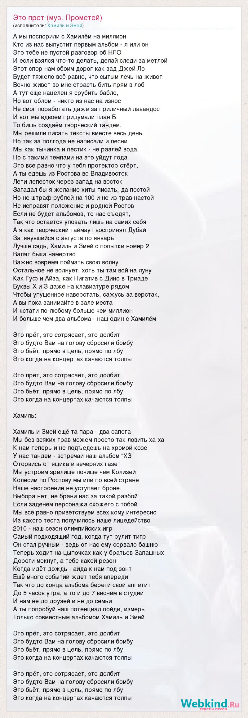 А мы поспорили с Хамилём на миллион Кто из нас выпустит первым альбом - я или он Это тебе не пустой разговор об НЛО И если взялся что-то делать, делай следи за метлой Этот спор нам обоим дорог как зад Джей Ло Будет тяжело всё равно, что сытым лечь на живот Вечно живет во мне страсть бить прям в лоб А тут еще нацелен я срубить бабло, Но вот облом - никто из нас на износ Не смог поработать даже за приличный лавандос И вот мы вдвоем придумали план Б То бишь создаём творческий тандем. Мы решили писать тексты вместе весь день Но так за полгода не написали и песни Мы как тычинка и пестик - не разлей вода, Но с такими темпами на это уйдут года Это все равно что у тебя протектор стёрт, А ты едешь из Ростова во Владивосток Лети лепесток через запад на восток Загадал бы я желание хиты писать, да постой Но не штраф рублей на 100 и не из трав настой Не исправят положение и родной Ростов Если не будет альбомов, то нас съедят, Так что остается уповать лишь на самих себя А я как творческий таймаут воспринял Дубай Затянувшийся с августа по январь Лучше сядь, Хамиль и Змей с попытки номер 2 Валят быка намертво Важно вовремя поймать свою волну Остальное не волнует, хоть ты там вой на луну Как Гуф и Айза, как Нигатив с Дино в Триаде Буквы Х и З даже на клавиатуре рядом Чтобы упущенное наверстать, сажусь за верстак, А вы пока занимайте в зале места И кстати по-любому больше чем миллион И больше чем два альбома - наш один с Хамилём Это прёт, это сотрясает, это долбит Это будто Вам на голову сбросили бомбу Это бьёт, прямо в цель, прямо по лбу Это когда на концертах качаются толпы Это прёт, это сотрясает, это долбит Это будто Вам на голову сбросили бомбу Это бьёт, прямо в цель, прямо по лбу Это когда на концертах качаются толпы Хамиль: Хамиль и Змей ещё та пара - два сапога Мы без всяких трав можем просто так ловить ха-ха К нам теперь и не подъедешь на хромой козе У нас тандем - встречай наш альбом "ХЗ" Оторвись от ящика и вечерних газет Мы устроим зрелище почище чем Колизей Колесим по Ростову мы или по всей стране Наше настроение не уступает броне. Выбора нет, не брани нас за такой разбой Если заденем персонажа схожего с тобой Мы всё равно приветствуем всех кому интересно Из какого теста получилось наше лицедейство 2010 - наш сезон олимпийских игр Самый подходящий год, когда тут рулит тигр Он стал ручным - ведь от нас ему сорвало башню Теперь ходит на цыпочках как у братьев Запашных Дороги мокнут, а тебе какой резон Когда идёт дождь - айда к нам под зонт Ещё много событий ждет тебя впереди Так что до конца альбома береги свой аппетит До 5 часов утра, а то и до 7 виснем в студии И нам не до друзей и не до семьи А ты попробуй наш потенциал пойди, измерь Только совместным альбомом Хамиль и Змей Это прёт, это сотрясает, это долбит Это будто Вам на голову сбросили бомбу Это бьёт, прямо в цель, прямо по лбу Это когда на концертах качаются толпы Это прёт, это сотрясает, это долбит Это будто Вам на голову сбросили бомбу Это бьёт, прямо в цель, прямо по лбу Это когда на концертах качаются толпы