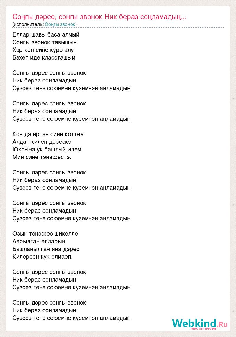 Еллар шавы баса алмый Сонгы звонок тавышын Хэр кон сине курэ алу Бэхет иде классташым Сонгы дэрес сонгы звонок Ник бераз сонламадын Сузсез генэ союемне куземнэн анламадын Сонгы дэрес сонгы звонок Ник бераз сонламадын Сузсез генэ союемне куземнэн анламадын Кон дэ иртэн сине коттем Алдан килеп дэрескэ Юксына ук башлый идем Мин сине тэнэфестэ. Сонгы дэрес сонгы звонок Ник бераз сонламадын Сузсез генэ союемне куземнэн анламадын Сонгы дэрес сонгы звонок Ник бераз сонламадын Сузсез генэ союемне куземнэн анламадын Озын тэнэфес шикелле Аерылган елларын Башланылган яна дэрес Килерсен кук елмаеп. Сонгы дэрес сонгы звонок Ник бераз сонламадын Сузсез генэ союемне куземнэн анламадын Сонгы дэрес сонгы звонок Ник бераз сонламадын Сузсез генэ союемне куземнэн анламадын