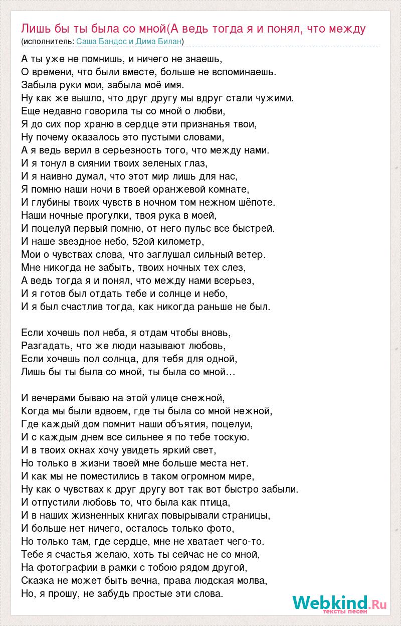 Главная→Исполнители→Саша Бандос и Дима Билан→Лишь бы ты была со мной(А ведь тогда я и понял, что между нами всерьез