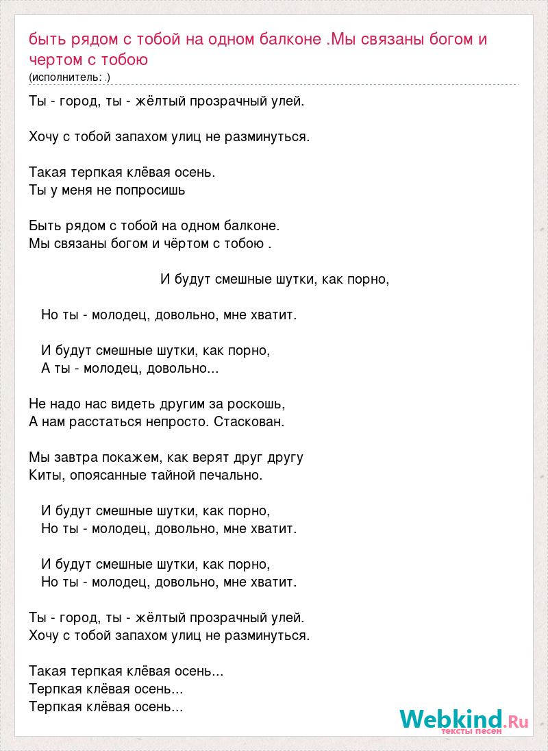 Быть рядом с тобой на одном балконе .Мы связаны богом и чертом с тобою