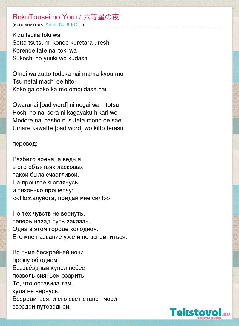 Kizu tsuita toki wa Sotto tsutsumi konde kuretara ureshii Korende tate nai toki wa Sukoshi no yuuki wo kudasai Omoi wa zutto todoka nai mama kyou mo Tsumetai machi de hitori Koko ga doko ka mo omoi dase nai Owaranai yoru ni negai wa hitotsu Hoshi no nai sora ni kagayaku hikari wo Modore nai basho ni suteta mono de sae Umare kawatte [bad word] wo kitto terasu перевод: Разбито время, а ведь я в его объятьях ласковых такой была счастливой. На прошлое я оглянусь и тихонько прошепчу: <<Пожалуйста, придай мне сил!>> Но тех чувств не вернуть, теперь назад путь заказан. Одна в этом городе холодном. Его мне название уже и не вспомниться. Во тьме бескрайней ночи прошу об одном: Беззвёздный купол небес позволь сияньем озарить. То, что оставила там, куда не вернусь, Возродиться, и его свет станет моей звездой путеводной.