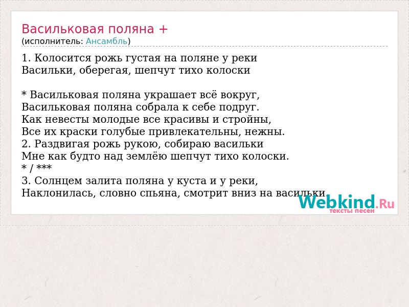 1. Колосится рожь густая на поляне у реки Васильки, оберегая, шепчут тихо колоски * Васильковая поляна украшает всё вокруг, Васильковая поляна собрала к себе подруг. Как невесты молодые все красивы и стройны, Все их краски голубые привлекательны, нежны. 2. Раздвигая рожь рукою, собираю васильки Мне как будто над землёю шепчут тихо колоски. * / *** 3. Солнцем залита поляна у куста и у реки, Наклонилась, словно спьяна, смотрит вниз на васильки.