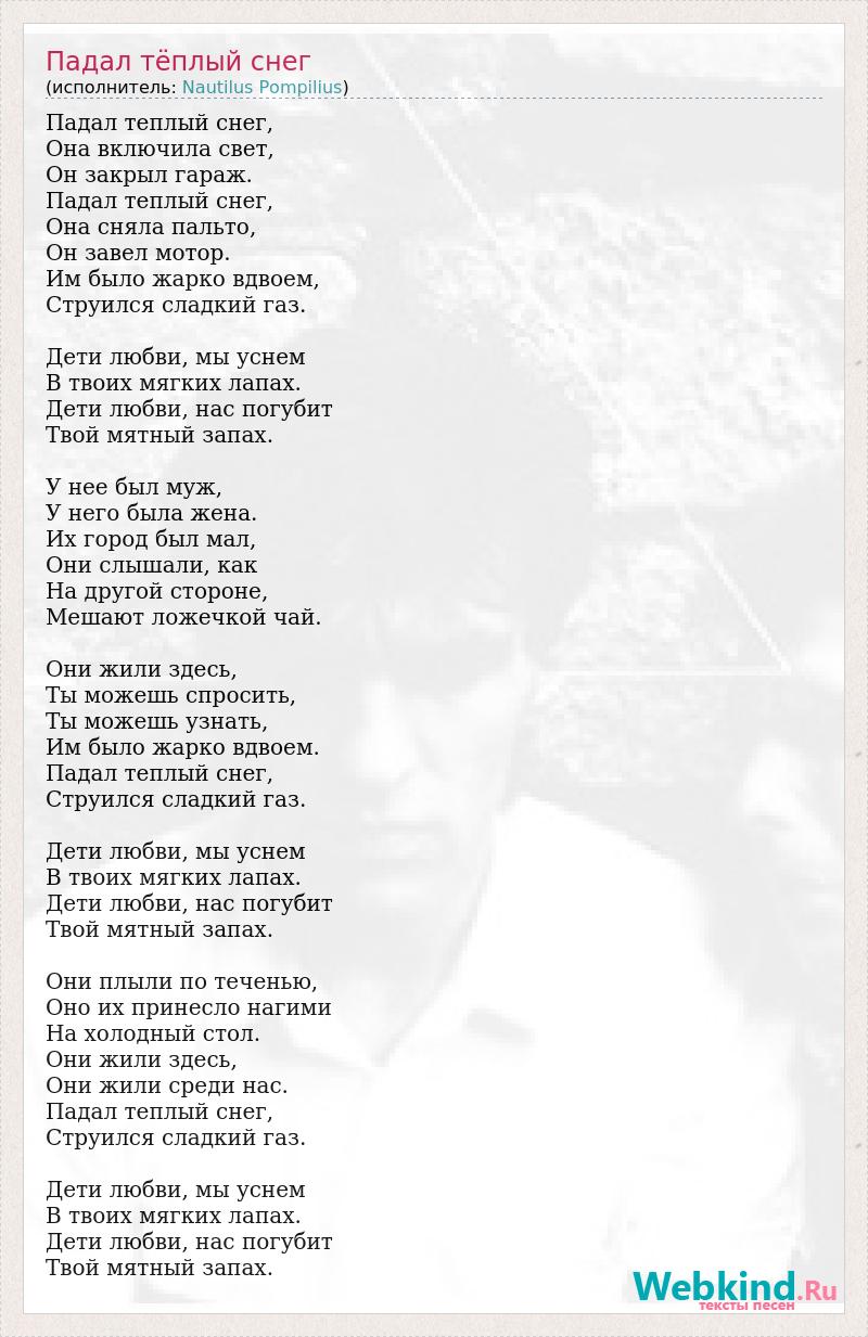 Падал теплый снег, Она включила свет, Он закрыл гараж. Падал теплый снег, Она сняла пальто, Он завел мотор. Им было жарко вдвоем, Струился сладкий газ. Дети любви, мы уснем В твоих мягких лапах. Дети любви, нас погубит Твой мятный запах. У нее был муж, У него была жена. Их город был мал, Они слышали, как На другой стороне, Мешают ложечкой чай. Они жили здесь, Ты можешь спросить, Ты можешь узнать, Им было жарко вдвоем. Падал теплый снег, Струился сладкий газ. Дети любви, мы уснем В твоих мягких лапах. Дети любви, нас погубит Твой мятный запах. Они плыли по теченью, Оно их принесло нагими На холодный стол. Они жили здесь, Они жили среди нас. Падал теплый снег, Струился сладкий газ. Дети любви, мы уснем В твоих мягких лапах. Дети любви, нас погубит Твой мятный запах.