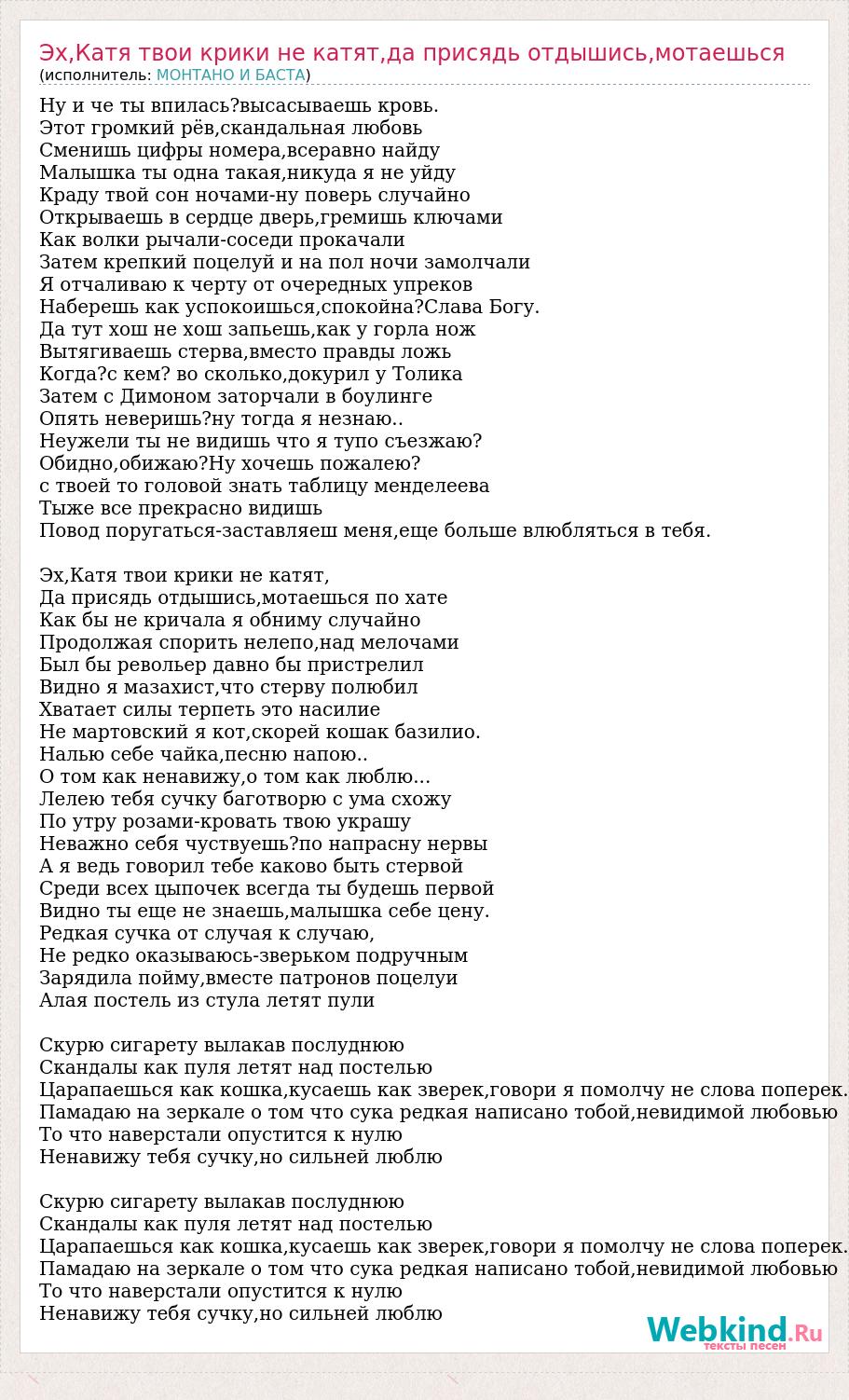 Ну и че ты впилась?высасываешь кровь. Этот громкий рёв,скандальная любовь Сменишь цифры номера,всеравно найду Малышка ты одна такая,никуда я не уйду Краду твой сон ночами-ну поверь случайно Открываешь в сердце дверь,гремишь ключами Как волки рычали-соседи прокачали Затем крепкий поцелуй и на пол ночи замолчали Я отчаливаю к черту от очередных упреков Наберешь как успокоишься,спокойна?Слава Богу. Да тут хош не хош запьешь,как у горла нож Вытягиваешь стерва,вместо правды ложь Когда?с кем? во сколько,докурил у Толика Затем с Димоном заторчали в боулинге Опять неверишь?ну тогда я незнаю.. Неужели ты не видишь что я тупо съезжаю? Обидно,обижаю?Ну хочешь пожалею? с твоей то головой знать таблицу менделеева Тыже все прекрасно видишь Повод поругаться-заставляеш меня,еще больше влюбляться в тебя. Эх,Катя твои крики не катят, Да присядь отдышись,мотаешься по хате Как бы не кричала я обниму случайно Продолжая спорить нелепо,над мелочами Был бы револьер давно бы пристрелил Видно я мазахист,что стерву полюбил Хватает силы терпеть это насилие Не мартовский я кот,скорей кошак базилио. Налью себе чайка,песню напою.. О том как ненавижу,о том как люблю... Лелею тебя сучку баготворю с ума схожу По утру розами-кровать твою украшу Неважно себя чуствуешь?по напрасну нервы А я ведь говорил тебе каково быть стервой Среди всех цыпочек всегда ты будешь первой Видно ты еще не знаешь,малышка себе цену. Редкая сучка от случая к случаю, Не редко оказываюсь-зверьком подручным Зарядила пойму,вместе патронов поцелуи Алая постель из стула летят пули Скурю сигарету вылакав послуднюю Скандалы как пуля летят над постелью Царапаешься как кошка,кусаешь как зверек,говори я помолчу не слова поперек. Памадаю на зеркале о том что сука редкая написано тобой,невидимой любовью То что наверстали опустится к нулю Ненавижу тебя сучку,но сильней люблю Скурю сигарету вылакав послуднюю Скандалы как пуля летят над постелью Царапаешься как кошка,кусаешь как зверек,говори я помолчу не слова поперек. Памадаю на зеркале о том что сука редкая написано тобой,невидимой любовью То что наверстали опустится к нулю Ненавижу тебя сучку,но сильней люблю