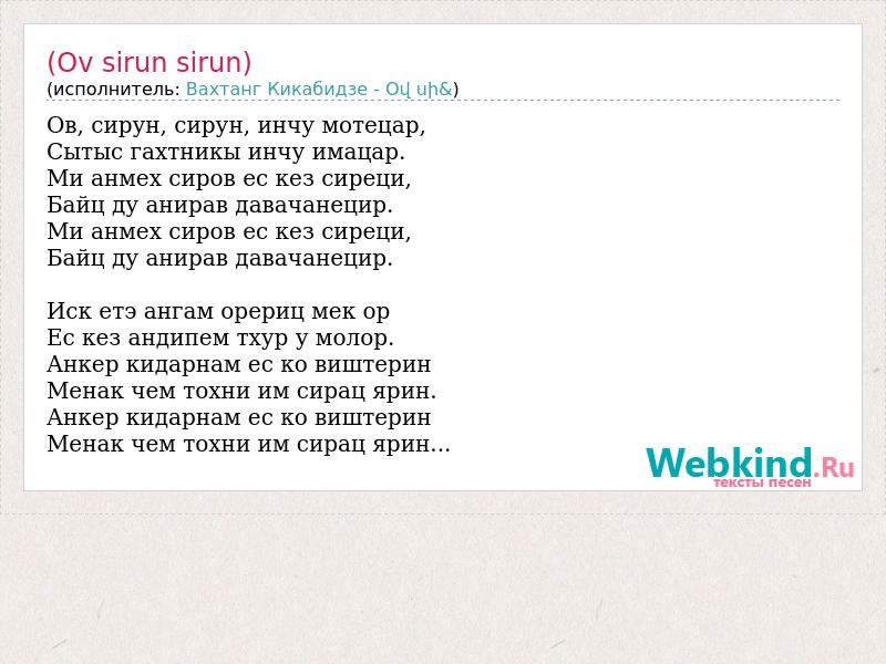 Ов, сирун, сирун, инчу мотецар, Сытыс гахтникы инчу имацар. Ми анмех сиров ес кез сиреци, Байц ду анирав давачанецир. Ми анмех сиров ес кез сиреци, Байц ду анирав давачанецир. Иск етэ ангам орериц мек ор Ес кез андипем тхур у молор. Анкер кидарнам ес ко виштерин Менак чем тохни им сирац ярин. Анкер кидарнам ес ко виштерин Менак чем тохни им сирац ярин...