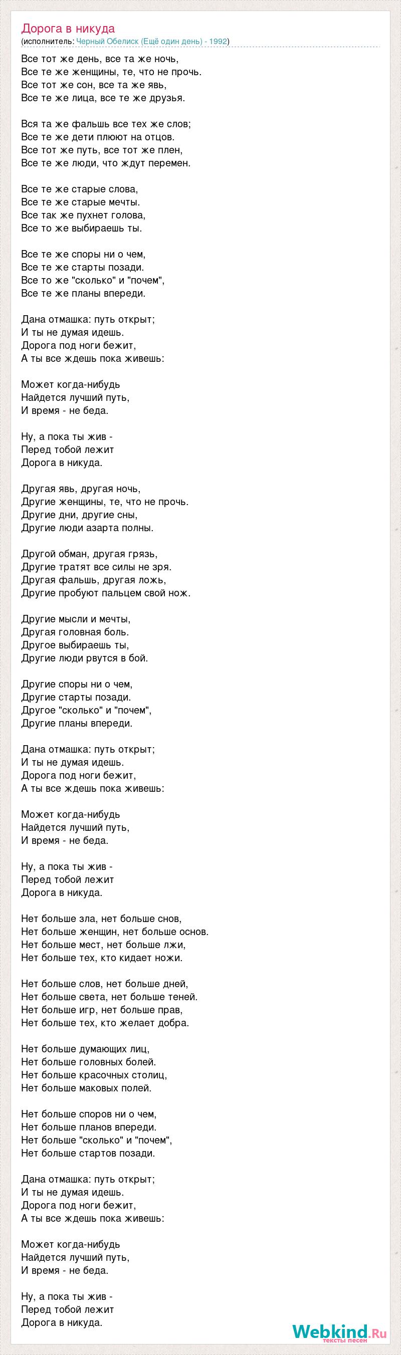 Все тот же день, все та же ночь, Все те же женщины, те, что не прочь. Все тот же сон, все та же явь, Все те же лица, все те же друзья. Вся та же фальшь все тех же слов; Все те же дети плюют на отцов. Все тот же путь, все тот же плен, Все те же люди, что ждут перемен. Все те же старые слова, Все те же старые мечты. Все так же пухнет голова, Все то же выбираешь ты. Все те же споры ни о чем, Все те же старты позади. Все то же "сколько" и "почем", Все те же планы впереди. Дана отмашка: путь открыт; И ты не думая идешь. Дорога под ноги бежит, А ты все ждешь пока живешь: Может когда-нибудь Найдется лучший путь, И время - не беда. Ну, а пока ты жив - Перед тобой лежит Дорога в никуда. Другая явь, другая ночь, Другие женщины, те, что не прочь. Другие дни, другие сны, Другие люди азарта полны. Другой обман, другая грязь, Другие тратят все силы не зря. Другая фальшь, другая ложь, Другие пробуют пальцем свой нож. Другие мысли и мечты, Другая головная боль. Другое выбираешь ты, Другие люди рвутся в бой. Другие споры ни о чем, Другие старты позади. Другое "сколько" и "почем", Другие планы впереди. Дана отмашка: путь открыт; И ты не думая идешь. Дорога под ноги бежит, А ты все ждешь пока живешь: Может когда-нибудь Найдется лучший путь, И время - не беда. Ну, а пока ты жив - Перед тобой лежит Дорога в никуда. Нет больше зла, нет больше снов, Нет больше женщин, нет больше основ. Нет больше мест, нет больше лжи, Нет больше тех, кто кидает ножи. Нет больше слов, нет больше дней, Нет больше света, нет больше теней. Нет больше игр, нет больше прав, Нет больше тех, кто желает добра. Нет больше думающих лиц, Нет больше головных болей. Нет больше красочных столиц, Нет больше маковых полей. Нет больше споров ни о чем, Нет больше планов впереди. Нет больше "сколько" и "почем", Нет больше стартов позади. Дана отмашка: путь открыт; И ты не думая идешь. Дорога под ноги бежит, А ты все ждешь пока живешь: Может когда-нибудь Найдется лучший путь, И время - не беда. Ну, а пока ты жив - Перед тобой лежит Дорога в никуда.