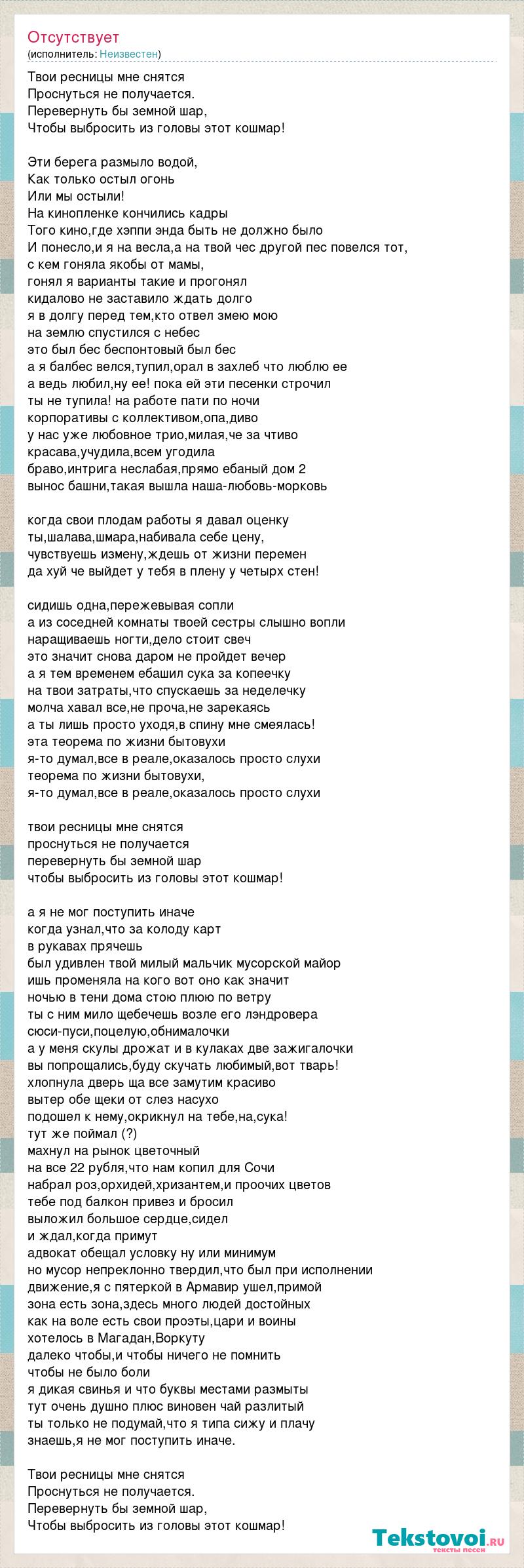 Твои ресницы мне снятся Проснуться не получается. Перевернуть бы земной шар, Чтобы выбросить из головы этот кошмар! Эти берега размыло водой, Как только остыл огонь Или мы остыли! На кинопленке кончились кадры Того кино,где хэппи энда быть не должно было И понесло,и я на весла,а на твой чес другой пес повелся тот, с кем гоняла якобы от мамы, гонял я варианты такие и прогонял кидалово не заставило ждать долго я в долгу перед тем,кто отвел змею мою на землю спустился с небес это был бес беспонтовый был бес а я балбес велся,тупил,орал в захлеб что люблю ее а ведь любил,ну ее! пока ей эти песенки строчил ты не тупила! на работе пати по ночи корпоративы с коллективом,опа,диво у нас уже любовное трио,милая,че за чтиво красава,учудила,всем угодила браво,интрига неслабая,прямо ебаный дом 2 вынос башни,такая вышла наша-любовь-морковь когда свои плодам работы я давал оценку ты,шалава,шмара,набивала себе цену, чувствуешь измену,ждешь от жизни перемен да хуй че выйдет у тебя в плену у четырх стен! сидишь одна,пережевывая сопли а из соседней комнаты твоей сестры слышно вопли наращиваешь ногти,дело стоит свеч это значит снова даром не пройдет вечер а я тем временем ебашил сука за копеечку на твои затраты,что спускаешь за неделечку молча хавал все,не проча,не зарекаясь а ты лишь просто уходя,в спину мне смеялась! эта теорема по жизни бытовухи я-то думал,все в реале,оказалось просто слухи теорема по жизни бытовухи, я-то думал,все в реале,оказалось просто слухи твои ресницы мне снятся проснуться не получается перевернуть бы земной шар чтобы выбросить из головы этот кошмар! а я не мог поступить иначе когда узнал,что за колоду карт в рукавах прячешь был удивлен твой милый мальчик мусорской майор ишь променяла на кого вот оно как значит ночью в тени дома стою плюю по ветру ты с ним мило щебечешь возле его лэндровера сюси-пуси,поцелую,обнималочки а у меня скулы дрожат и в кулаках две зажигалочки вы попрощались,буду скучать любимый,вот тварь! хлопнула дверь ща все замутим красиво вытер обе щеки от слез насухо подошел к нему,окрикнул на тебе,на,сука! тут же поймал (?) махнул на рынок цветочный на все 22 рубля,что нам копил для Сочи набрал роз,орхидей,хризантем,и проочих цветов тебе под балкон привез и бросил выложил большое сердце,сидел и ждал,когда примут адвокат обещал условку ну или минимум но мусор непреклонно твердил,что был при исполнении движение,я с пятеркой в Армавир ушел,примой зона есть зона,здесь много людей достойных как на воле есть свои проэты,цари и воины хотелось в Магадан,Воркуту далеко чтобы,и чтобы ничего не помнить чтобы не было боли я дикая свинья и что буквы местами размыты тут очень душно плюс виновен чай разлитый ты только не подумай,что я типа сижу и плачу знаешь,я не мог поступить иначе. Твои ресницы мне снятся Проснуться не получается. Перевернуть бы земной шар, Чтобы выбросить из головы этот кошмар!