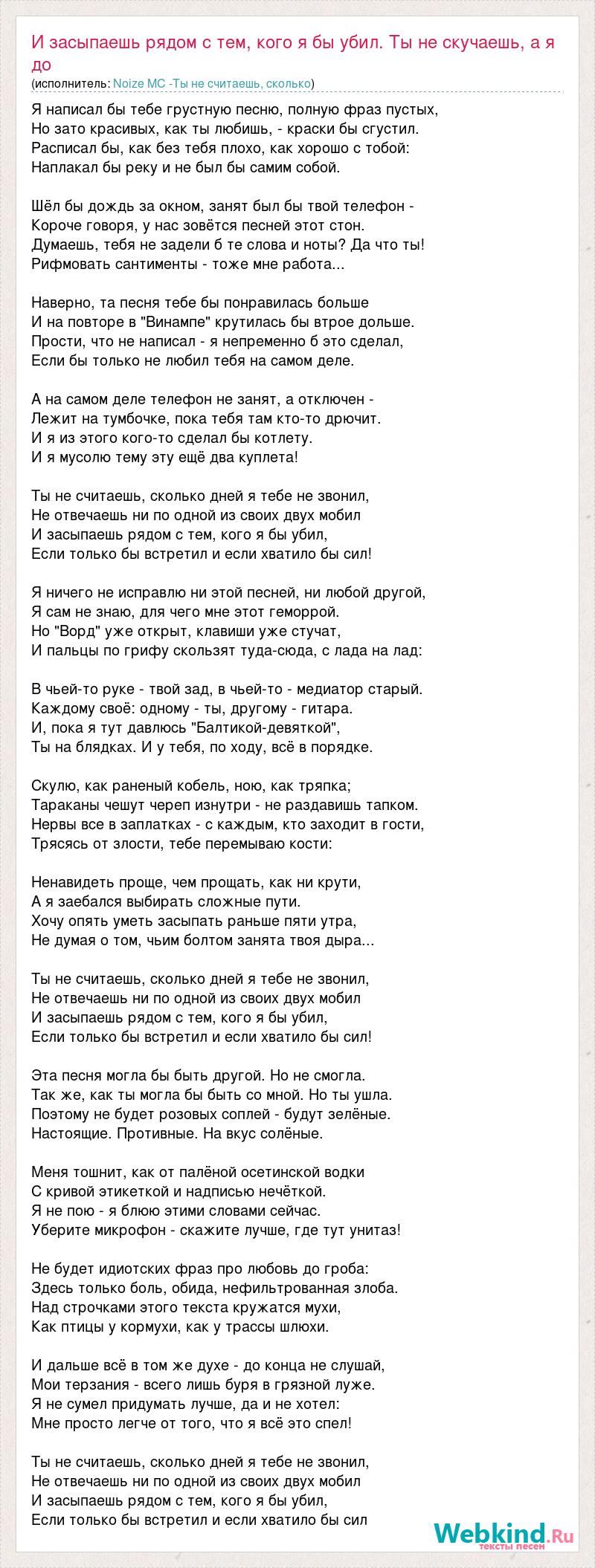 Главная→Исполнители→Noize MC -Ты не считаешь, сколько→И засыпаешь рядом с тем, кого я бы убил. Ты не скучаешь, а я до