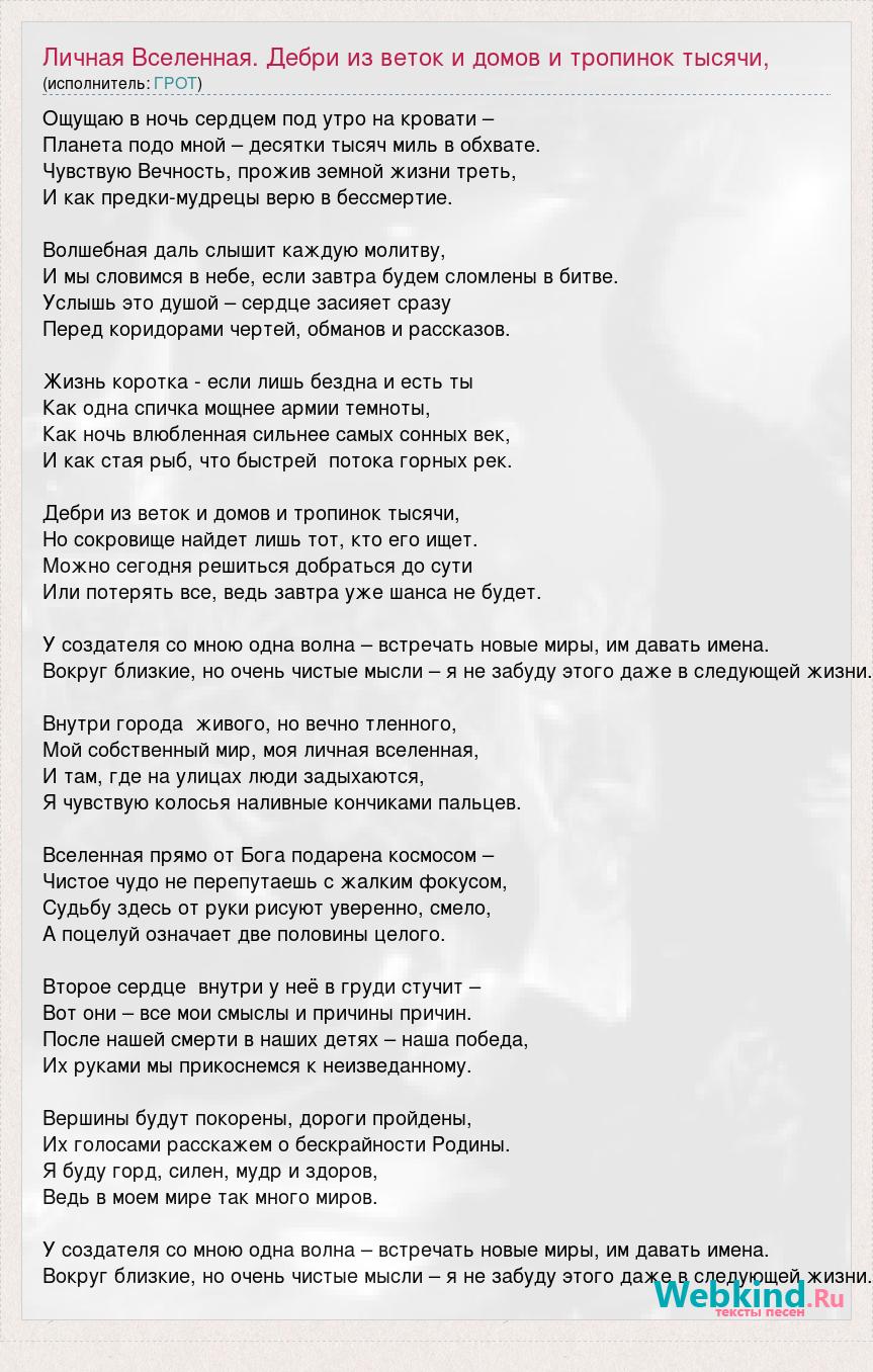 Ощущаю в ночь сердцем под утро на кровати – Планета подо мной – десятки тысяч миль в обхвате. Чувствую Вечность, прожив земной жизни треть, И как предки-мудрецы верю в бессмертие. Волшебная даль слышит каждую молитву, И мы словимся в небе, если завтра будем сломлены в битве. Услышь это душой – сердце засияет сразу Перед коридорами чертей, обманов и рассказов. Жизнь коротка - если лишь бездна и есть ты Как одна спичка мощнее армии темноты, Как ночь влюбленная сильнее самых сонных век, И как стая рыб, что быстрей потока горных рек. Дебри из веток и домов и тропинок тысячи, Но сокровище найдет лишь тот, кто его ищет. Можно сегодня решиться добраться до сути Или потерять все, ведь завтра уже шанса не будет. У создателя со мною одна волна – встречать новые миры, им давать имена. Вокруг близкие, но очень чистые мысли – я не забуду этого даже в следующей жизни. Внутри города живого, но вечно тленного, Мой собственный мир, моя личная вселенная, И там, где на улицах люди задыхаются, Я чувствую колосья наливные кончиками пальцев. Вселенная прямо от Бога подарена космосом – Чистое чудо не перепутаешь с жалким фокусом, Судьбу здесь от руки рисуют уверенно, смело, А поцелуй означает две половины целого. Второе сердце внутри у неё в груди стучит – Вот они – все мои смыслы и причины причин. После нашей смерти в наших детях – наша победа, Их руками мы прикоснемся к неизведанному. Вершины будут покорены, дороги пройдены, Их голосами расскажем о бескрайности Родины. Я буду горд, силен, мудр и здоров, Ведь в моем мире так много миров. У создателя со мною одна волна – встречать новые миры, им давать имена. Вокруг близкие, но очень чистые мысли – я не забуду этого даже в следующей жизни.