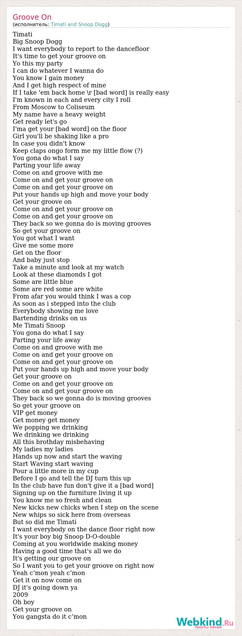 Timati Big Snoop Dogg I want everybody to report to the dancefloor It's time to get your groove on Yo this my party I can do whatever I wanna do You know I gain money And I get high respect of mine If I take 'em back home \r [bad word] is really easy I'm known in each and every city I roll From Moscow to Coliseum My name have a heavy weight Get ready let's go I'ma get your [bad word] on the floor Girl you'll be shaking like a pro In case you didn't know Keep claps ongo form me my little flow (?) You gona do what I say Parting your life away Come on and groove with me Come on and get your groove on Come on and get your groove on Put your hands up high and move your body Get your groove on Come on and get your groove on Come on and get your groove on They back so we gonna do is moving grooves So get your groove on You got what I want Give me some more Get on the floor And baby just stop Take a minute and look at my watch Look at these diamonds I got Some are little blue Some are red some are white From afar you would think I was a cop As soon as i stepped into the club Everybody showing me love Bartending drinks on us Me Timati Snoop You gona do what I say Parting your life away Come on and groove with me Come on and get your groove on Come on and get your groove on Put your hands up high and move your body Get your groove on Come on and get your groove on Come on and get your groove on They back so we gonna do is moving grooves So get your groove on VIP get money Get money get money We popping we drinking We drinking we drinking All this brothday misbehaving My ladies my ladies Hands up now and start the waving Start Waving start waving Pour a little more in my cup Before I go and tell the DJ turn this up In the club have fun don't give it a [bad word] Signing up on the furniture living it up You know me so fresh and clean New kicks new chicks when I step on the scene New whips so sick here from overseas But so did me Timati I want everybody on the dance floor right now It's your boy big Snoop D-O-double Coming at you worldwide making money Having a good time that's all we do It's getting our groove on So I want you to get your groove on right now Yeah c’mon yeah c’mon Get it on now come on DJ it's going down ya 2009 Oh boy Get your groove on You gangsta do it c’mon