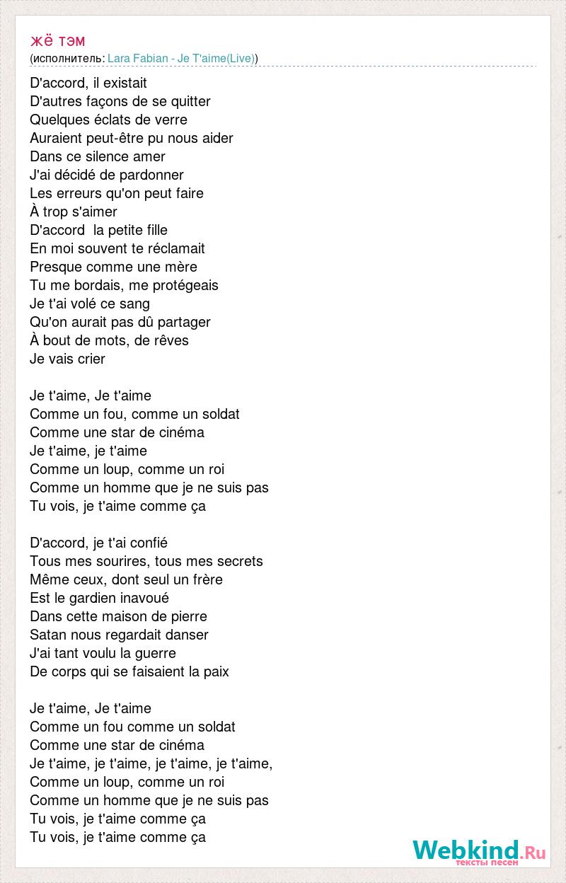 D'accord, il existait D'autres façons de se quitter Quelques éclats de verre Auraient peut-être pu nous aider Dans ce silence amer J'ai décidé de pardonner Les erreurs qu'on peut faire À trop s'aimer D'accord la petite fille En moi souvent te réclamait Presque comme une mère Tu me bordais, me protégeais Je t'ai volé ce sang Qu'on aurait pas dû partager À bout de mots, de rêves Je vais crier Je t'aime, Je t'aime Comme un fou, comme un soldat Comme une star de cinéma Je t'aime, je t'aime Comme un loup, comme un roi Comme un homme que je ne suis pas Tu vois, je t'aime comme ça D'accord, je t'ai confié Tous mes sourires, tous mes secrets Même ceux, dont seul un frère Est le gardien inavoué Dans cette maison de pierre Satan nous regardait danser J'ai tant voulu la guerre De corps qui se faisaient la paix Je t'aime, Je t'aime Comme un fou comme un soldat Comme une star de cinéma Je t'aime, je t'aime, je t'aime, je t'aime, Comme un loup, comme un roi Comme un homme que je ne suis pas Tu vois, je t'aime comme ça Tu vois, je t'aime comme ça