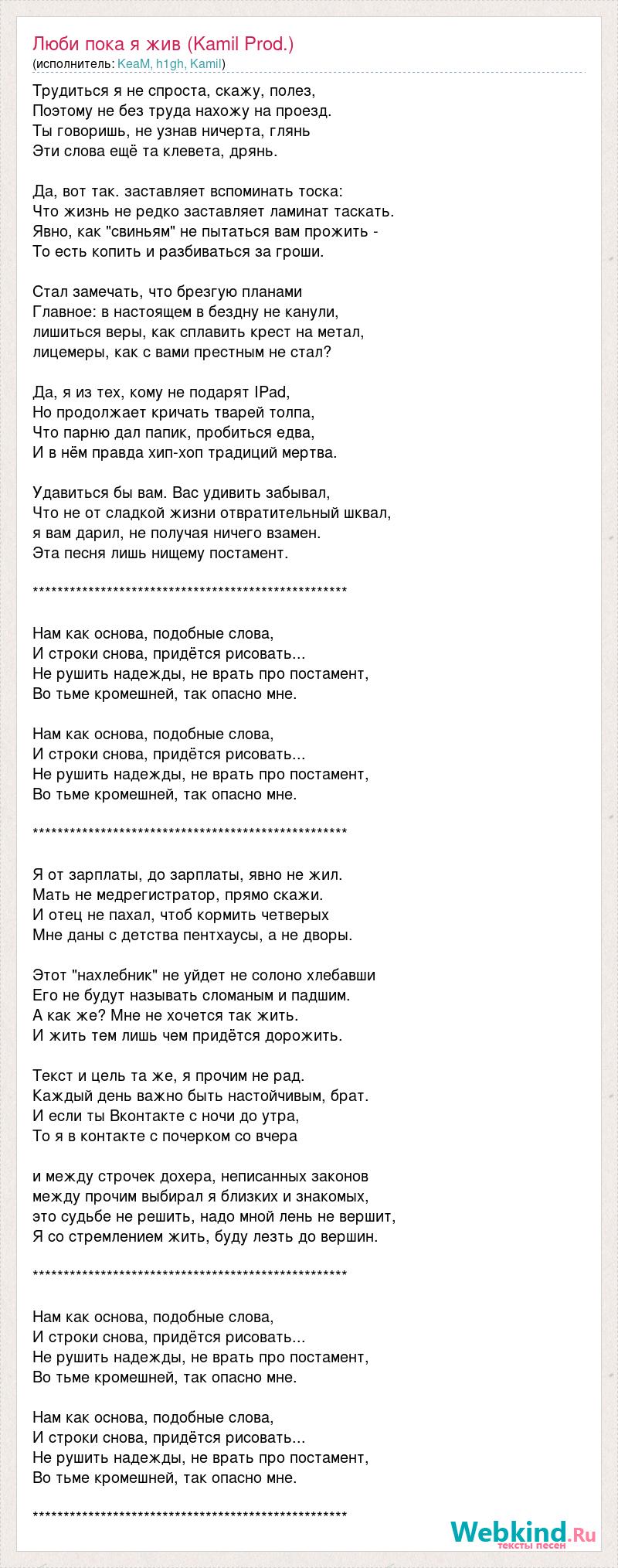 Трудиться я не спроста, скажу, полез, Поэтому не без труда нахожу на проезд. Ты говоришь, не узнав ничерта, глянь Эти слова ещё та клевета, дрянь. Да, вот так. заставляет вспоминать тоска: Что жизнь не редко заставляет ламинат таскать. Явно, как "свиньям" не пытаться вам прожить - То есть копить и разбиваться за гроши. Стал замечать, что брезгую планами Главное: в настоящем в бездну не канули, лишиться веры, как сплавить крест на метал, лицемеры, как с вами престным не стал? Да, я из тех, кому не подарят IPad, Но продолжает кричать тварей толпа, Что парню дал папик, пробиться едва, И в нём правда хип-хоп традиций мертва. Удавиться бы вам. Вас удивить забывал, Что не от сладкой жизни отвратительный шквал, я вам дарил, не получая ничего взамен. Эта песня лишь нищему постамент. *************************************************** Нам как основа, подобные слова, И строки снова, придётся рисовать... Не рушить надежды, не врать про постамент, Во тьме кромешней, так опасно мне. Нам как основа, подобные слова, И строки снова, придётся рисовать... Не рушить надежды, не врать про постамент, Во тьме кромешней, так опасно мне. *************************************************** Я от зарплаты, до зарплаты, явно не жил. Мать не медрегистратор, прямо скажи. И отец не пахал, чтоб кормить четверых Мне даны с детства пентхаусы, а не дворы. Этот "нахлебник" не уйдет не солоно хлебавши Его не будут называть сломаным и падшим. А как же? Мне не хочется так жить. И жить тем лишь чем придётся дорожить. Текст и цель та же, я прочим не рад. Каждый день важно быть настойчивым, брат. И если ты Вконтакте с ночи до утра, То я в контакте с почерком со вчера и между строчек дохера, неписанных законов между прочим выбирал я близких и знакомых, это судьбе не решить, надо мной лень не вершит, Я со стремлением жить, буду лезть до вершин. *************************************************** Нам как основа, подобные слова, И строки снова, придётся рисовать... Не рушить надежды, не врать про постамент, Во тьме кромешней, так опасно мне. Нам как основа, подобные слова, И строки снова, придётся рисовать... Не рушить надежды, не врать про постамент, Во тьме кромешней, так опасно мне. ***************************************************