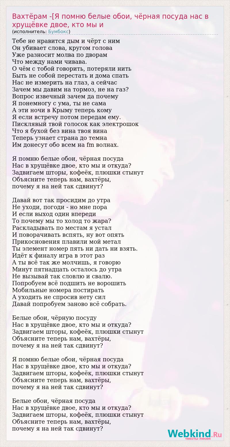 Тебе не нравится дым и чёрт с ним Он убивает слова, кругом голова Уже разносит молва по дворам Что между нами чивава. О чём с тобой говорить, потеряли нить Быть не собой перестать и дома спать Нас не измерить на глаз, а сейчас Зачем мы давим на тормоз, не на газ? Вопрос извечный зачем да почему Я понемногу с ума, ты не сама А эти ночи в Крыму теперь кому Я если встречу потом передам ему. Писклявый твой голосок как электрошок Что я бухой без вина твоя вина Теперь узнает страна до темна Им донесут обо всем на fm волнах. Я помню белые обои, чёрная посуда Нас в хрущёвке двое, кто мы и откуда? Задвигаем шторы, кофеёк, плюшки стынут Объясните теперь нам, вахтёры, почему я на ней так сдвинут? Давай вот так просидим до утра Не уходи, погоди - но мне пора И если выход один впереди То почему мы то холод то жара? Раскладывать по местам я устал И поворачивать вспять, ну вот опять Прикосновения плавили мой метал Ты элемент номер пять ни дать ни взять. Идёт к финалу игра в этот раз А ты всё так же молчишь, я говорю Минут пятнадцать осталось до утра Не вызывай так словлю и свалю. Попробуем всё подшить не ворошить Мобильные номера постирать А уходить не спросив нету сил Давай попробуем заново всё собрать. Белые обои, чёрную посуду Нас в хрущёвке двое, кто мы и откуда? Задвигаем шторы, кофеёк, плюшки стынут Объясните теперь нам, вахтёры, почему я на ней так сдвинут? Я помню белые обои, чёрная посуда Нас в хрущёвке двое, кто мы и откуда? Задвигаем шторы, кофеёк, плюшки стынут Объясните теперь нам, вахтёры, почему я на ней так сдвинут? Белые обои, чёрная посуда Нас в хрущёвке двое, кто мы и откуда? Задвигаем шторы, кофеёк, плюшки стынут Объясните теперь нам, вахтёры, почему я на ней так сдвинут?