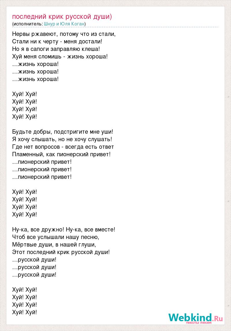 Нервы ржавеют, потому что из стали, Стали ни к черту - меня достали! Но я в сапоги заправляю клеша! Хуй меня сломишь - жизнь хороша! …жизнь хороша! …жизнь хороша! …жизнь хороша! Хуй! Хуй! Хуй! Хуй! Хуй! Хуй! Хуй! Хуй! Будьте добры, подстригите мне уши! Я хочу слышать, но не хочу слушать! Где нет вопросов - всегда есть ответ Пламенный, как пионерский привет! …пионерский привет! …пионерский привет! …пионерский привет! Хуй! Хуй! Хуй! Хуй! Хуй! Хуй! Хуй! Хуй! Ну-ка, все дружно! Ну-ка, все вместе! Чтоб все услышали нашу песню, Мёртвые души, в нашей глуши, Этот последний крик русской души! …русской души! …русской души! …русской души! Хуй! Хуй! Хуй! Хуй! Хуй! Хуй! Хуй! Хуй!