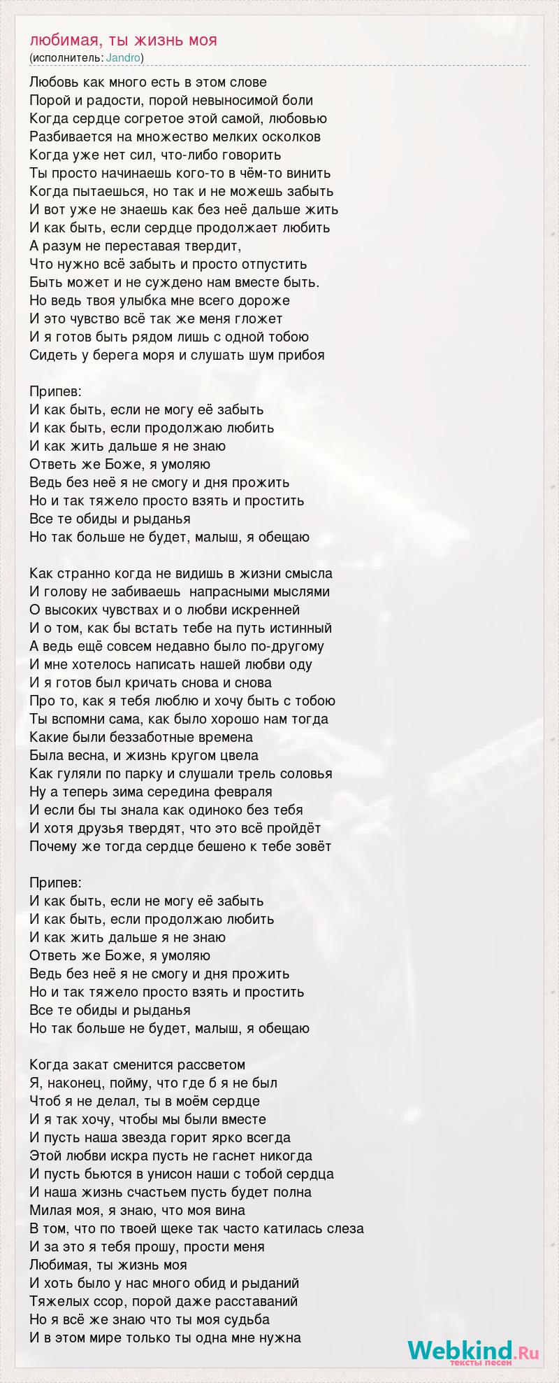 Любовь как много есть в этом слове Порой и радости, порой невыносимой боли Когда сердце согретое этой самой, любовью Разбивается на множество мелких осколков Когда уже нет сил, что-либо говорить Ты просто начинаешь кого-то в чём-то винить Когда пытаешься, но так и не можешь забыть И вот уже не знаешь как без неё дальше жить И как быть, если сердце продолжает любить А разум не переставая твердит, Что нужно всё забыть и просто отпустить Быть может и не суждено нам вместе быть. Но ведь твоя улыбка мне всего дороже И это чувство всё так же меня гложет И я готов быть рядом лишь с одной тобою Сидеть у берега моря и слушать шум прибоя Припев: И как быть, если не могу её забыть И как быть, если продолжаю любить И как жить дальше я не знаю Ответь же Боже, я умоляю Ведь без неё я не смогу и дня прожить Но и так тяжело просто взять и простить Все те обиды и рыданья Но так больше не будет, малыш, я обещаю Как странно когда не видишь в жизни смысла И голову не забиваешь напрасными мыслями О высоких чувствах и о любви искренней И о том, как бы встать тебе на путь истинный А ведь ещё совсем недавно было по-другому И мне хотелось написать нашей любви оду И я готов был кричать снова и снова Про то, как я тебя люблю и хочу быть с тобою Ты вспомни сама, как было хорошо нам тогда Какие были беззаботные времена Была весна, и жизнь кругом цвела Как гуляли по парку и слушали трель соловья Ну а теперь зима середина февраля И если бы ты знала как одиноко без тебя И хотя друзья твердят, что это всё пройдёт Почему же тогда сердце бешено к тебе зовёт Припев: И как быть, если не могу её забыть И как быть, если продолжаю любить И как жить дальше я не знаю Ответь же Боже, я умоляю Ведь без неё я не смогу и дня прожить Но и так тяжело просто взять и простить Все те обиды и рыданья Но так больше не будет, малыш, я обещаю Когда закат сменится рассветом Я, наконец, пойму, что где б я не был Чтоб я не делал, ты в моём сердце И я так хочу, чтобы мы были вместе И пусть наша звезда горит ярко всегда Этой любви искра пусть не гаснет никогда И пусть бьются в унисон наши с тобой сердца И наша жизнь счастьем пусть будет полна Милая моя, я знаю, что моя вина В том, что по твоей щеке так часто катилась слеза И за это я тебя прошу, прости меня Любимая, ты жизнь моя И хоть было у нас много обид и рыданий Тяжелых ссор, порой даже расставаний Но я всё же знаю что ты моя судьба И в этом мире только ты одна мне нужна