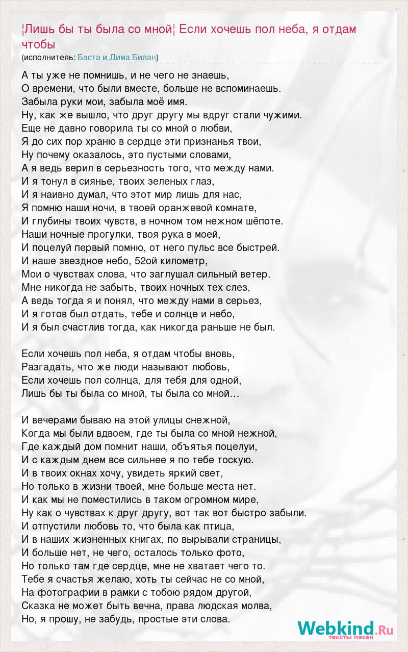 А ты уже не помнишь, и не чего не знаешь, О времени, что были вместе, больше не вспоминаешь. Забыла руки мои, забыла моё имя. Ну, как же вышло, что друг другу мы вдруг стали чужими. Еще не давно говорила ты со мной о любви, Я до сих пор храню в сердце эти признанья твои, Ну почему оказалось, это пустыми словами, А я ведь верил в серьезность того, что между нами. И я тонул в сиянье, твоих зеленых глаз, И я наивно думал, что этот мир лишь для нас, Я помню наши ночи, в твоей оранжевой комнате, И глубины твоих чувств, в ночном том нежном шёпоте. Наши ночные прогулки, твоя рука в моей, И поцелуй первый помню, от него пульс все быстрей. И наше звездное небо, 52ой километр, Мои о чувствах слова, что заглушал сильный ветер. Мне никогда не забыть, твоих ночных тех слез, А ведь тогда я и понял, что между нами в серьез, И я готов был отдать, тебе и солнце и небо, И я был счастлив тогда, как никогда раньше не был. Если хочешь пол неба, я отдам чтобы вновь, Разгадать, что же люди называют любовь, Если хочешь пол солнца, для тебя для одной, Лишь бы ты была со мной, ты была со мной… И вечерами бываю на этой улицы снежной, Когда мы были вдвоем, где ты была со мной нежной, Где каждый дом помнит наши, объятья поцелуи, И с каждым днем все сильнее я по тебе тоскую. И в твоих окнах хочу, увидеть яркий свет, Но только в жизни твоей, мне больше места нет. И как мы не поместились в таком огромном мире, Ну как о чувствах к друг другу, вот так вот быстро забыли. И отпустили любовь то, что была как птица, И в наших жизненных книгах, по вырывали страницы, И больше нет, не чего, осталось только фото, Но только там где сердце, мне не хватает чего то. Тебе я счастья желаю, хоть ты сейчас не со мной, На фотографии в рамки с тобою рядом другой, Сказка не может быть вечна, права людская молва, Но, я прошу, не забудь, простые эти слова.