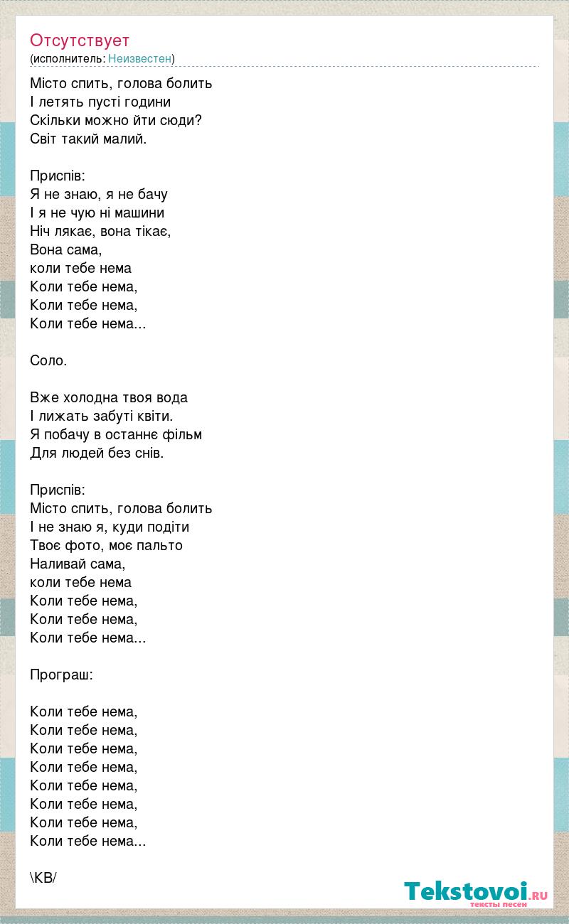 Мiсто спить, голова болить I летять пустi години Скiльки можно йти сюди? Свiт такий малий. Приспів: Я не знаю, я не бачу I я не чую нi машини Нiч лякає, вона тiкає, Вона сама, коли тебе нема Коли тебе нема, Коли тебе нема, Коли тебе нема... Соло. Вже холодна твоя вода I лижать забутi квiти. Я побачу в останнє фiльм Для людей без снiв. Приспів: Мiсто спить, голова болить I не знаю я, куди подiти Твоє фото, моє пальто Наливай сама, коли тебе нема Коли тебе нема, Коли тебе нема, Коли тебе нема... Програш: Коли тебе нема, Коли тебе нема, Коли тебе нема, Коли тебе нема, Коли тебе нема, Коли тебе нема, Коли тебе нема, Коли тебе нема... \КВ/